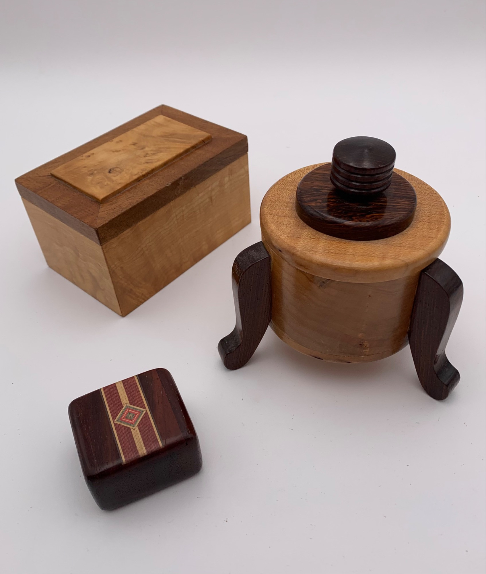 Group of 3 handmade boxes of wood - client says these were purchased from an artisan on the Olympic Peninsula - in excellent condition. Rectangular light wood box with stepped lid. We think this is maple from the striations in the wood. Green felt liner inside. Measures 3" H x 5" W x 3.25" D. Small square ring box with inlaid lid - multiple woods. Really exquisite inlay work! Measures 1.25" H x shy 2" W x 1.75" D. Lathe-turned dark & light wood cylinder box with shaped legs and knobbed lid. Lovely wood grain. Measures just over 5" H x 4.75" W x 4.75" D (includes leg projection). Additional boxes by same artist in Lot #162