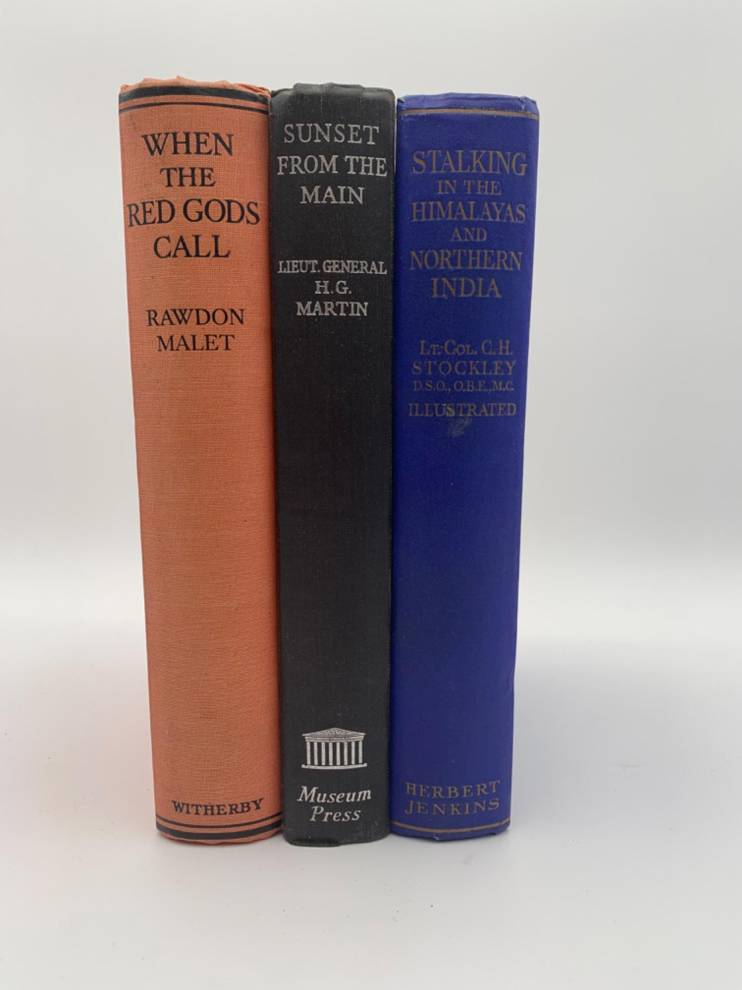 Trio of antique hunting books about hunting in what is now Pakistan, India, and Tibet. Client's father was a big game hunter from Alaska who hunted in the Americas and Asia. These are from his reference collection. Please see photos to judge condition for yourself. WHEN THE RED GODS CALL – BEING THE BIOGRAPHTY OF A SHIKARI