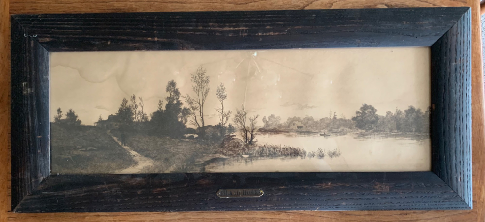 This lovely large-scale etching hung in the client's parents' home for many years and was considered "old" back then. In rich sepia tones, the piece is tranquil and immensely detailed. Very old black frame shows wear and age, as does the print itself (note the water stain in the upper left). With conservation the print could be pristine; however, we feel the patina of age is worn well here and would not touch the print - it's like a well-worn pair of pants - comfortable and obviously loved. Measures 15.75" H x just shy 36" W framed.