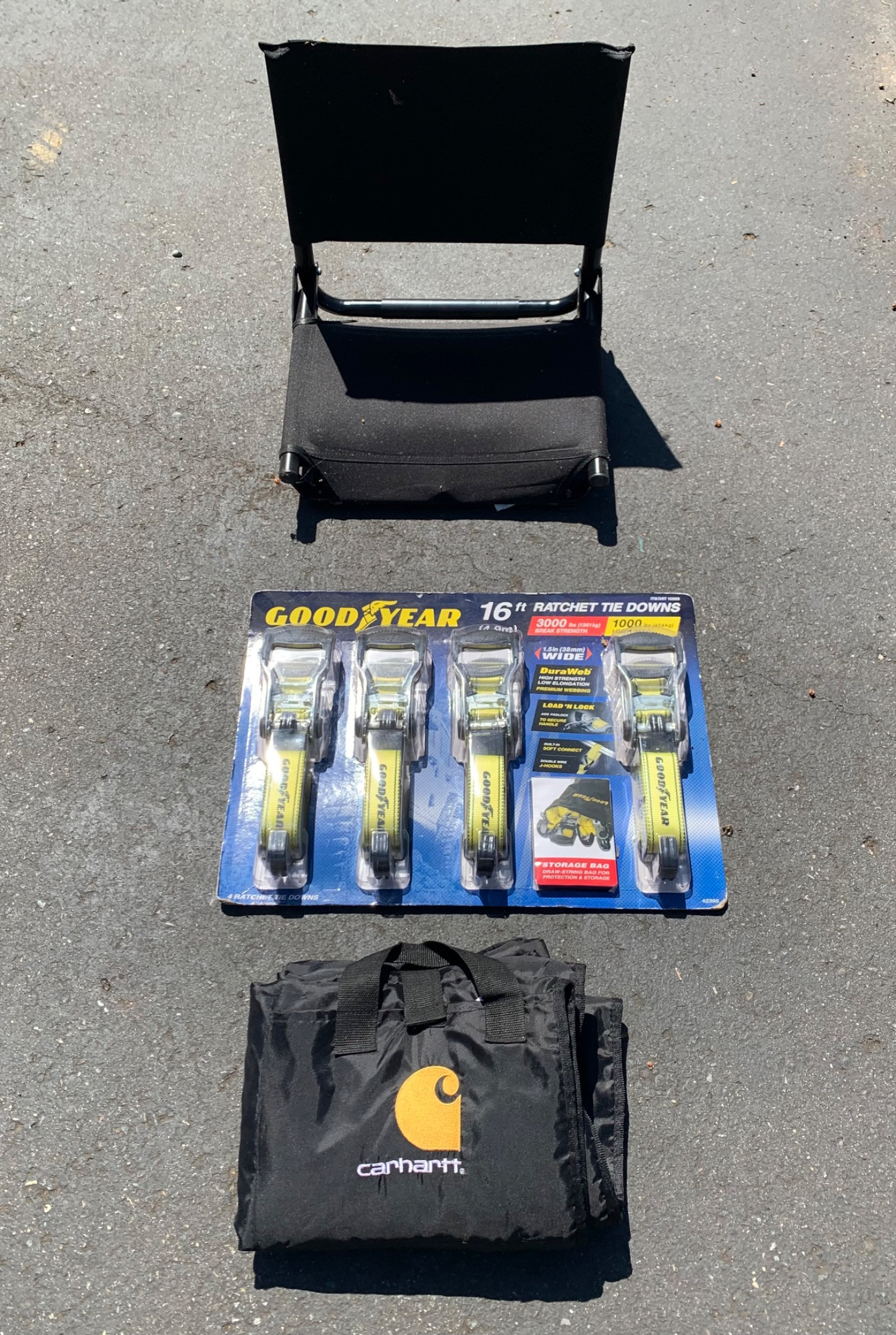 Enjoy the pre-game festivities with these little helpers: Set of 4 Goodyear 1,0000lb. load ratchets will hold your BBQ in place in the back of the truck as well as any other heavy items you take with you. New - includes storage bag, Stadium seat from Cascade Mountain in black nylon works just as well on the tailgate as the bleachers. Black nylon seat with black metal tubing - sturdy & adjustable with lacing system underneath. Carhartt double layer blanket - polar fleece on one size, waterproof nylon on the other. Folds up compactly with a Velcro tab, zip pocket for a phone or keys, and carry handles. Never used - just kept in car. Measures 48" x 58".