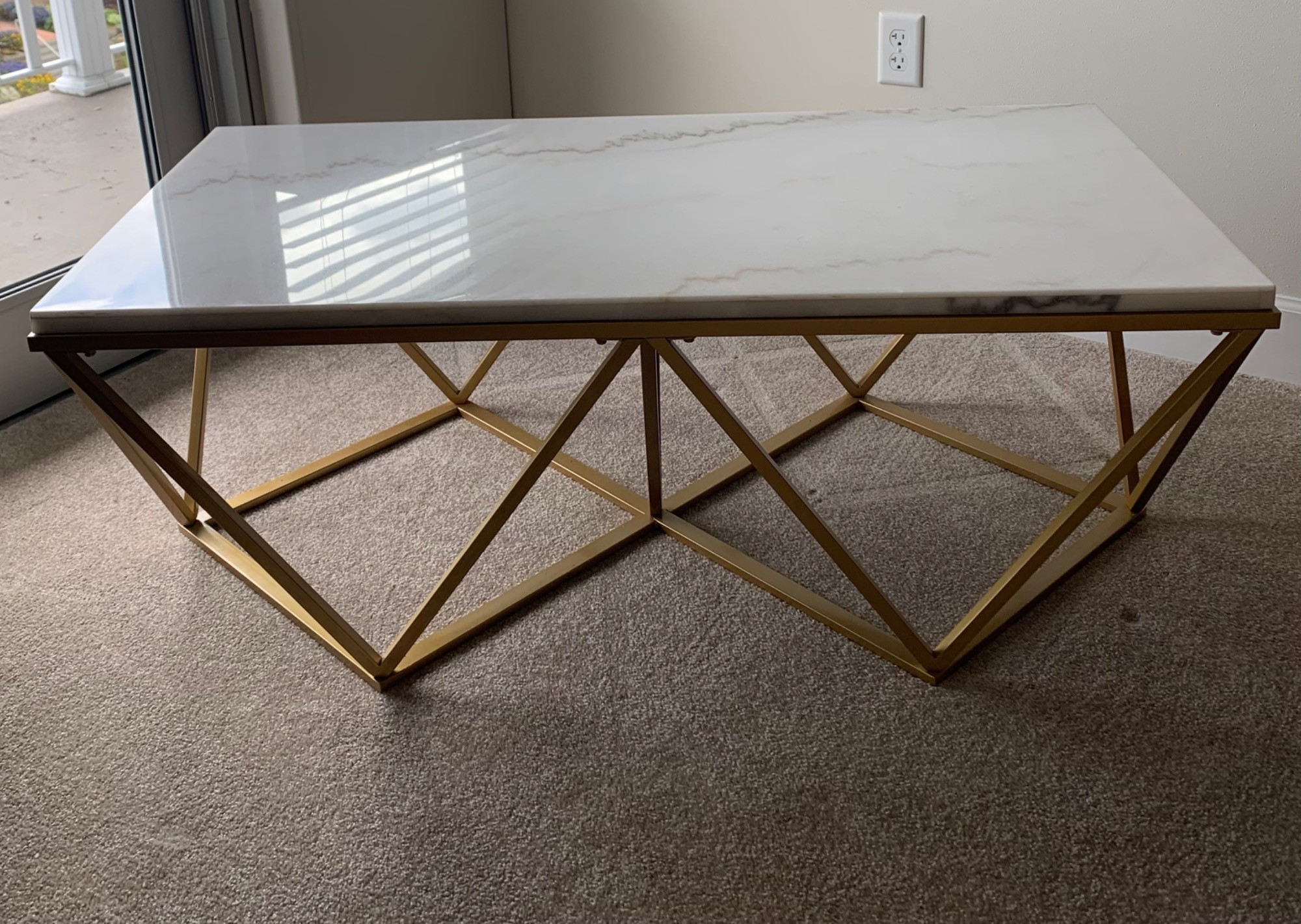 Terrific coffee table with gold powder-coated metal base and marble slab top. Top is off-white with grey veining approx. 1" thick - this is a heavy table that doesn't slide around! One unique feature is that unlike most coffee tables, you never kick the legs as you walk by - the geometric angle of the base at the corners prevents tripping. Solidly made, it fits well in contemporary decor settings. Please note: the table is in truly great condition except for the following: small scratch on one gold corner, & a slight scratch on the top surface so minor it is hard to photograph unless the light plays just right (see photo just after label). There is also one small bolt missing underneath the table, but none of these small flaws impair use, function, or aesthetics of the table at all. Last 3 photos are from the store website the table was purchased from - shows design a bit more clearly. Measures approx. 47.5" L x 24.5" W x 18" H LOCAL PICKUP ONLY ON THIS ITEM