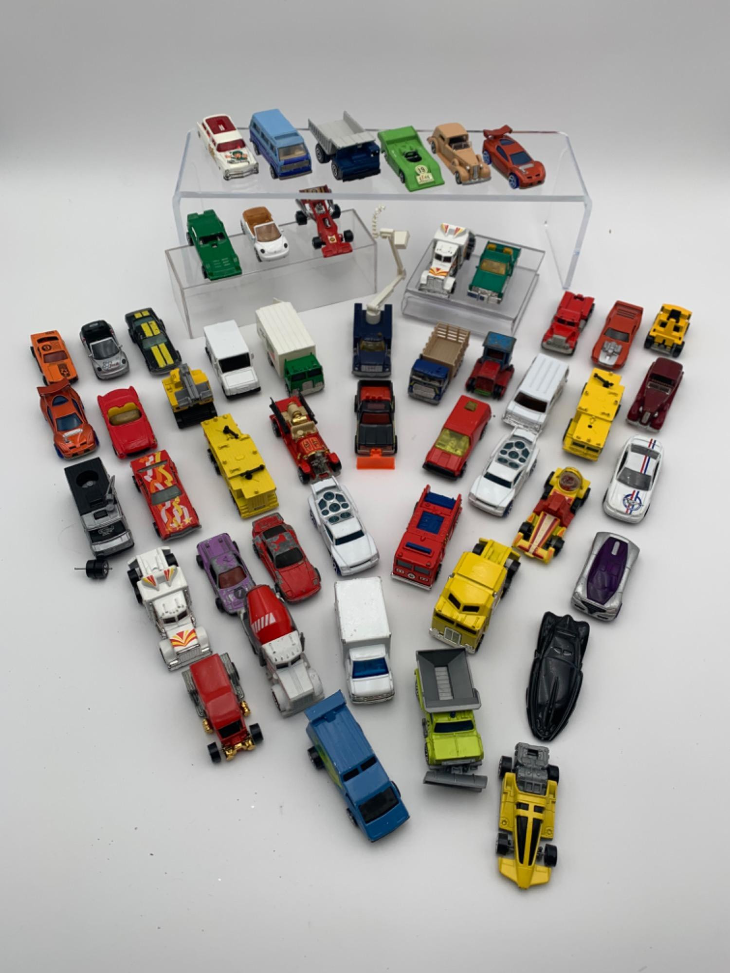Great group of 50+ "matchbox" cars from various manufacturers like Matchbox, Hot Wheels, etc. Ages span from the 1970s to early 2000s. Most are about 3" long. All have been loved in their previous lives but still have a lot of life yet. Note that Fed Ex truck is missing one of its back doors - see last photo.