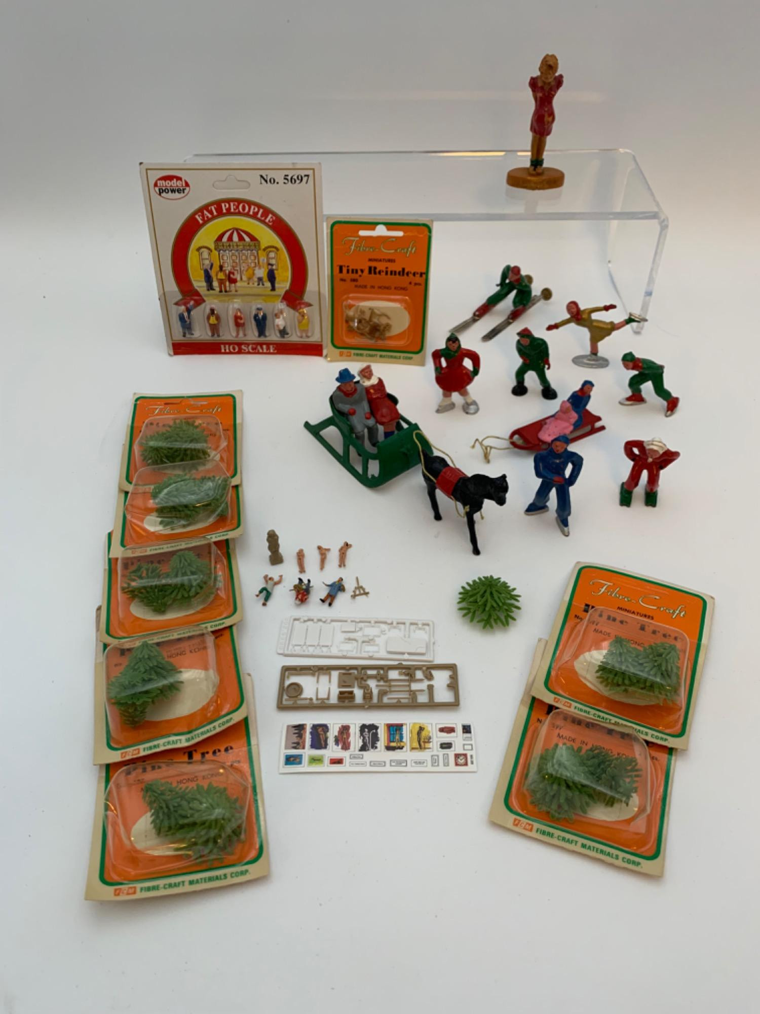 MIx of cast lead winter figures from the 1950s, vintage miniature trees & reindeer, German xtra-small art figures measuring less than 1", a set of "fat" people (their term, not ours), and a vintage "Killjoy was here" pregnant figurine we are guessing was from the late 1940s/early 1950s. Killjoy figure measures 3.5" H