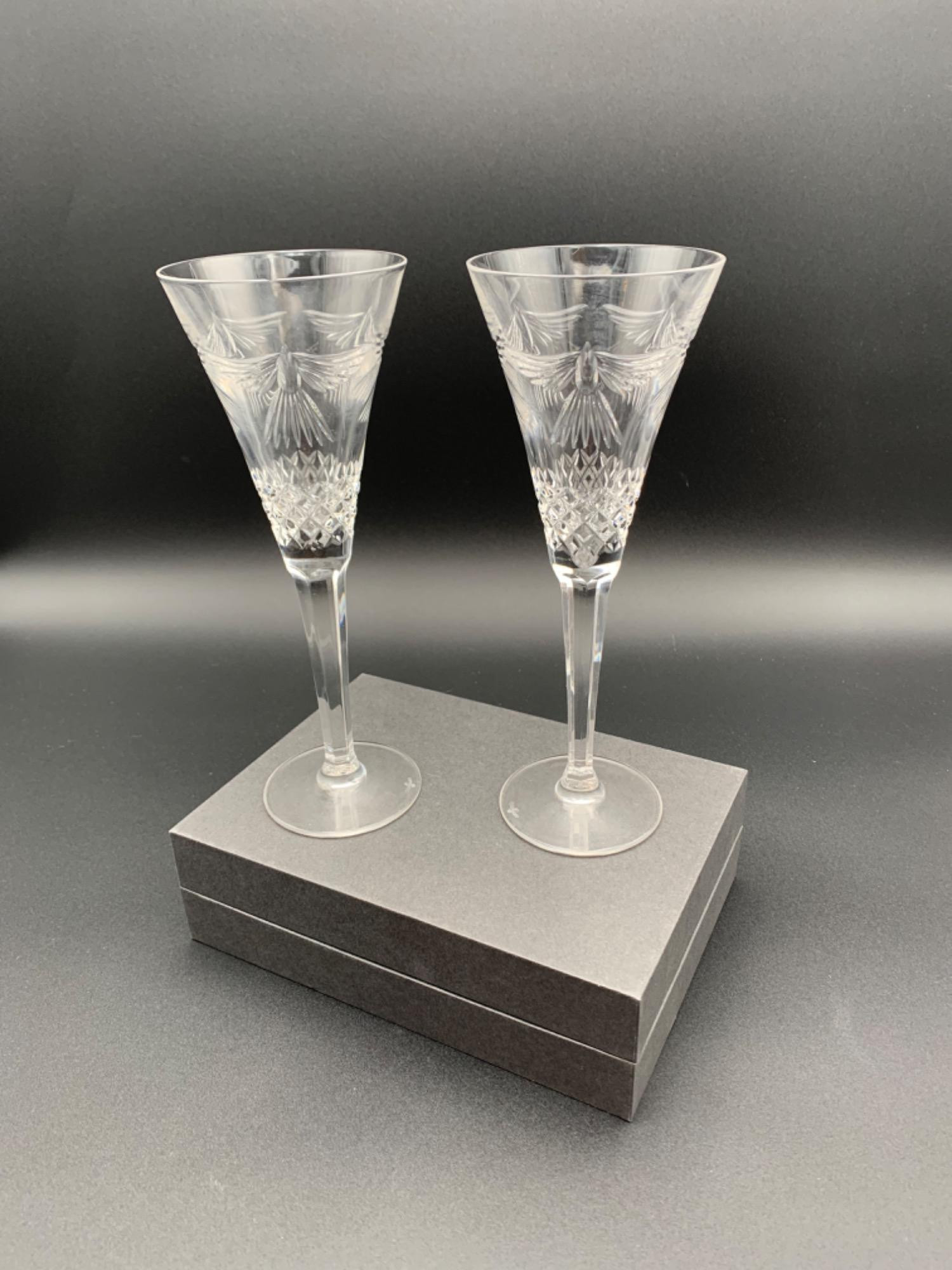 Exquisite pair of toasting champagne flutes from famous-maker Waterford celebrating the turn of the millennium. This is the 5th set in a series of 5 flute pairs specially created in Italy for the Year 2000 celebration. Dove signifying peace on the upper portion with straight edge bevels on stem. Waterford signature on base of each. Measure 9.25" H Comes with original box from Nordstrom. As we were photographing, we noticed a small divot on one of the rims - very very small, but wanted to point it out. See last photo. Same flutes for another seller on line: Other flutes/pieces from this series in Lot #10, Lot #124, Lot #168, and Lot #174.