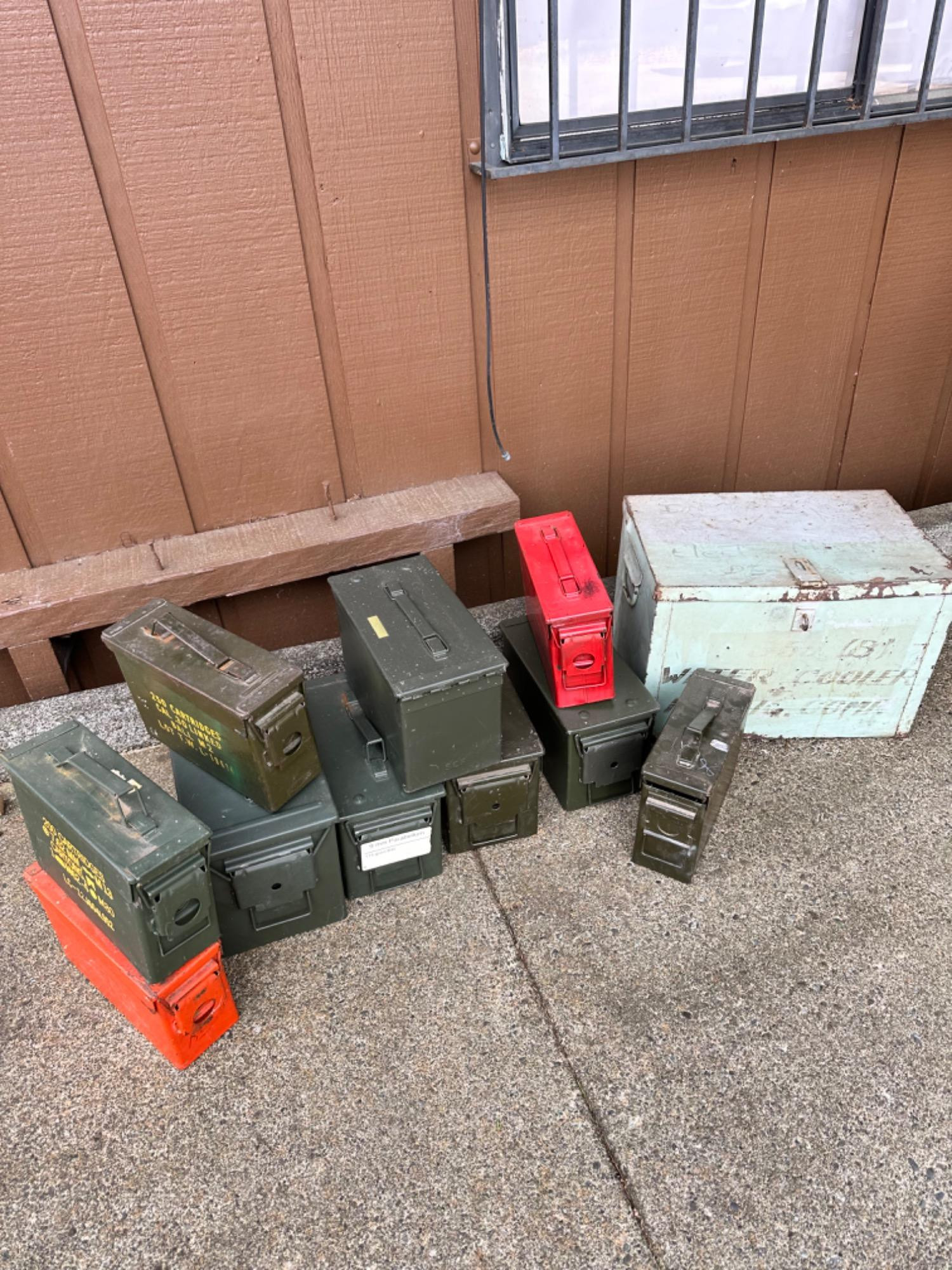 Cooler 18 W x 12 D x 12T Vintage metal water cooler and several ammo cans