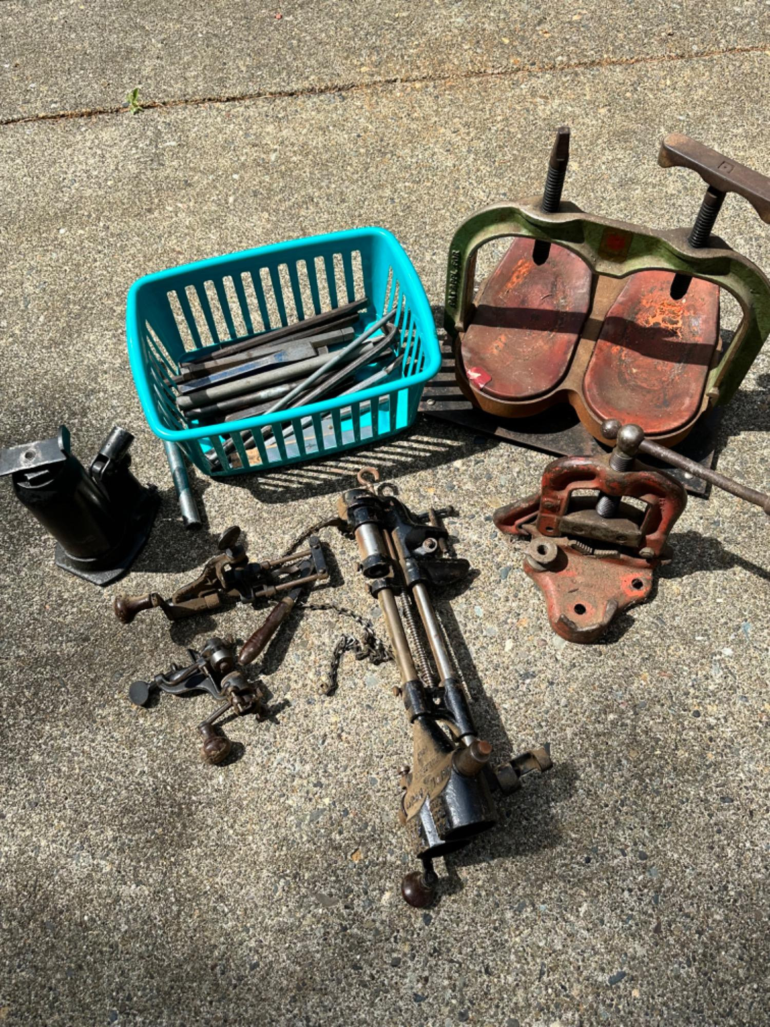 Antique Cobbler Sole Press, Pipe Vise, Shotgun Shell Loading Tool and more.
