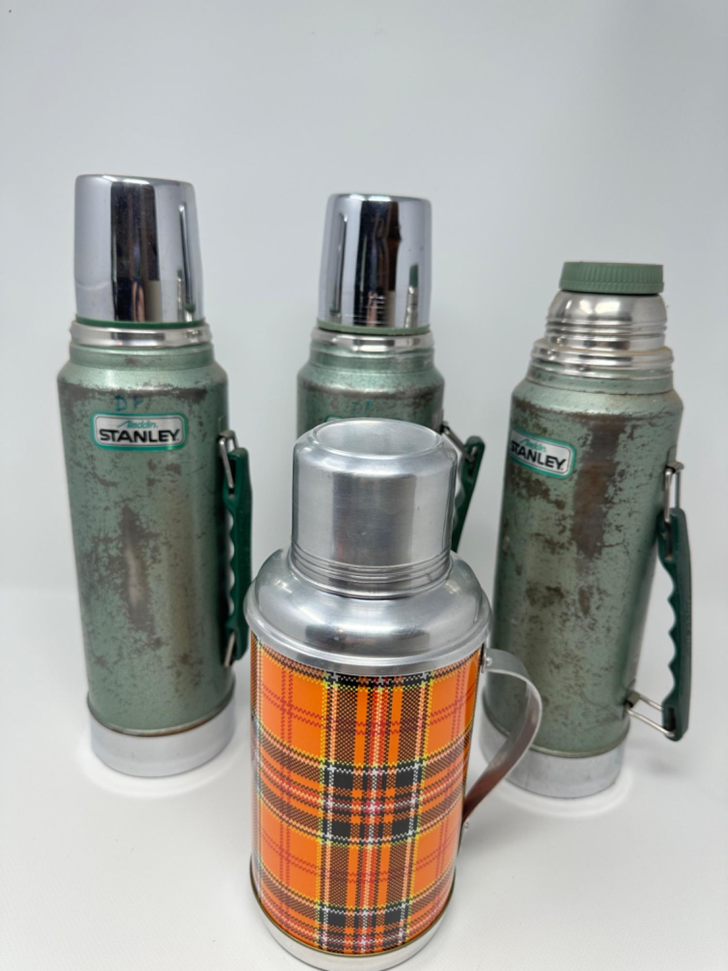 Vintage Stanley Thermos and Vintage Aladdin Plaid Vacuum Thermos. Please note one Stanley thermos is missing lid.