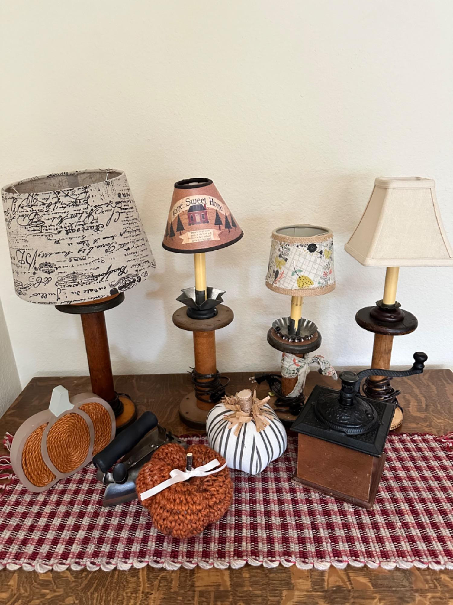 Lot # 88 - Antique Spool Lamps, Coffee Grinder and More