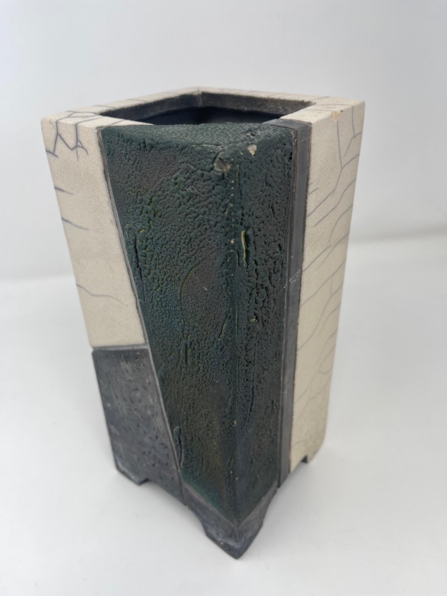 Lot # 10 - Tall Square Signed Raku Vase w/ White Crackle and Mixed Stone
