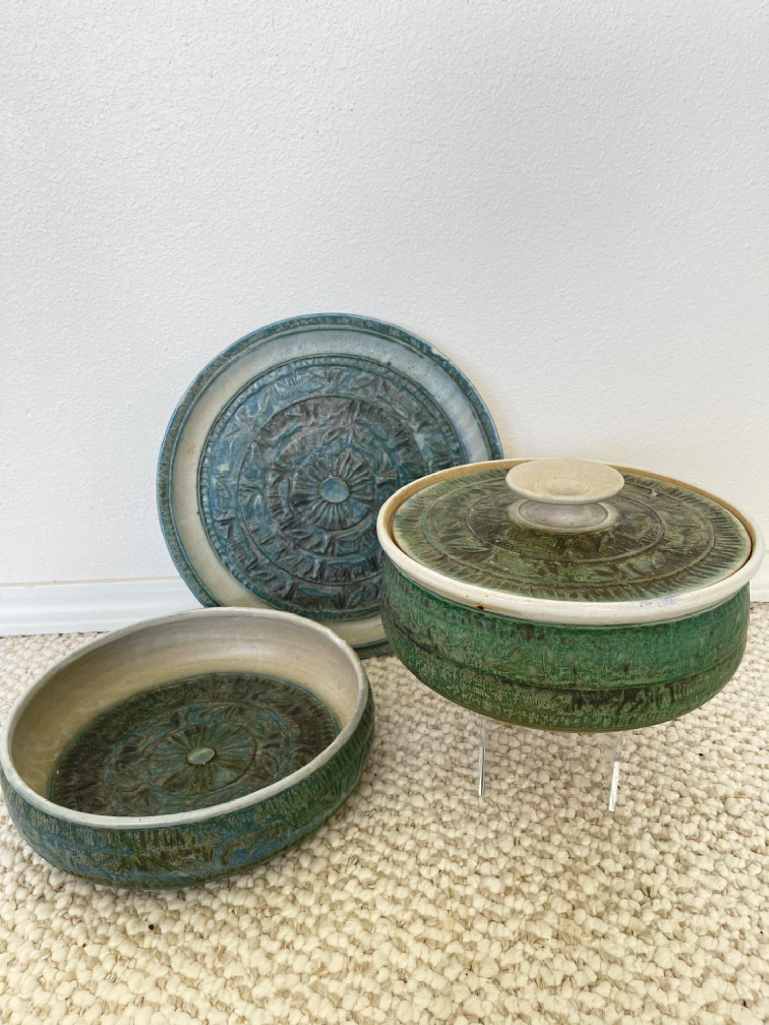 Blue Platter: 13.25 inches wide Blue Bowl: 10.5 inches wide x 3 inches tall Green Pot and Lid: 10.5 inches wide x 4.5 inches tall All in great condition. Pot has some minor blue staining.