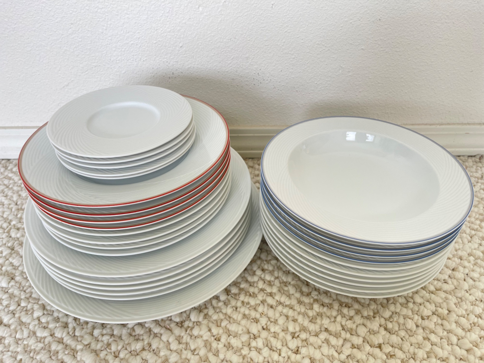(1) Large Round Serving Platter: 12 inches wide - Has a small red mark. Shown in last photo. (5) Dinner Plates: 10.75 inches wide (10) Dinner Bowls: 9 inches wide - (4) Blue Rimmed - (6) White Rimmed (8) Salad Plates: 9 inches wide - (4) Red Rimmed - (4) White Rimmed