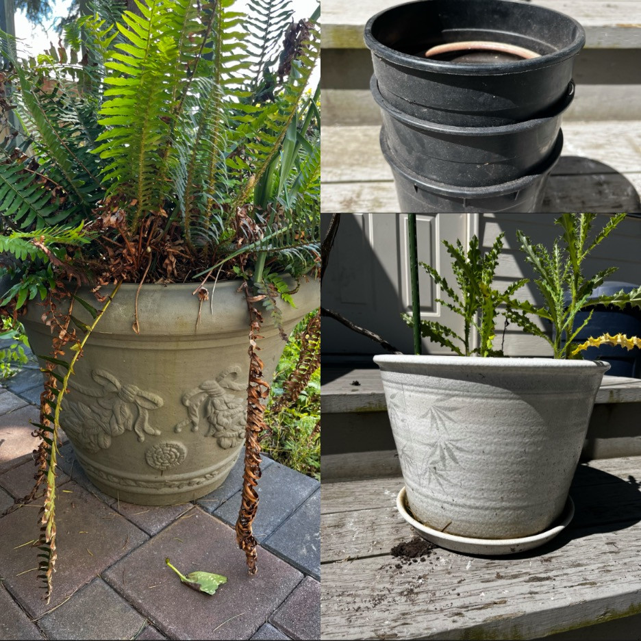 Big Pot: 17.75 inches x 25 inches - No big cracks or chips. In good condition and shouldn’t break when moving. Plant is in ok condition Medium Pot: 10.5 inches x 14 inches - Large cracks running down the sides, but pot is still holding together well. Plant appears to be doing well. Smaller Plastic Pots: 6.25 inches x 7 inches - No cracks or breaks in plastic.