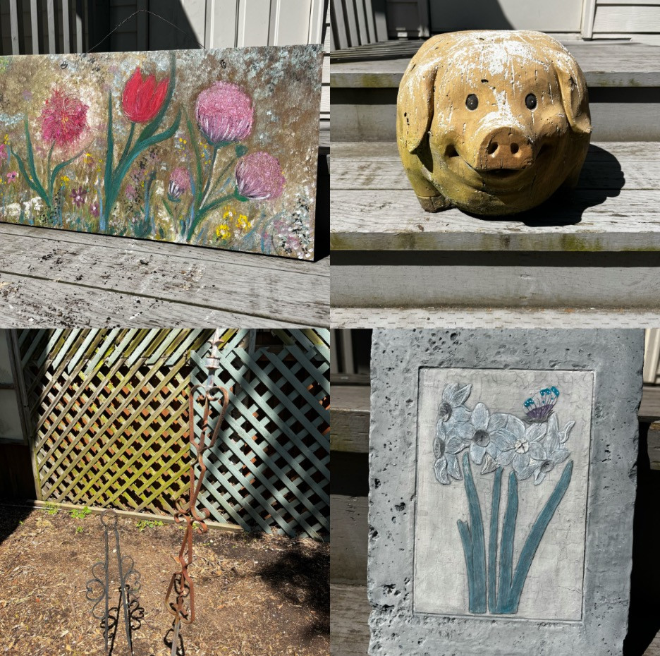 Pig: 12 inches x 13.75 inches x 18.75 inches Tong #1: 59.5 inches tall out of the ground Tong #2: 30.5 inches tall out of the ground Pink Floral Wood Painting: 30.5 inches W x 16.5 inches H Floral Stone Painting: 8.25 inches W x 11 inches H Details: Big Painting: Wood seems to be in fine condition. No major splitting or cracking. Paint looks to be well intact Little Painting: Design is undamaged, divots on edge of “canvas” but could’ve been part of the design. Hook on the back is rusty but can be switched out by removing a screw Pig: Some sun damage with loss of color, cracking and chips but could be a part of original design. Not too heavy and otherwise in good condition with no limbs or parts missing Tong 1: Considerably rusty but metal isn’t cracked or broke Tong 2: Some rust on top and other faces that angle up. No breaks or cracks