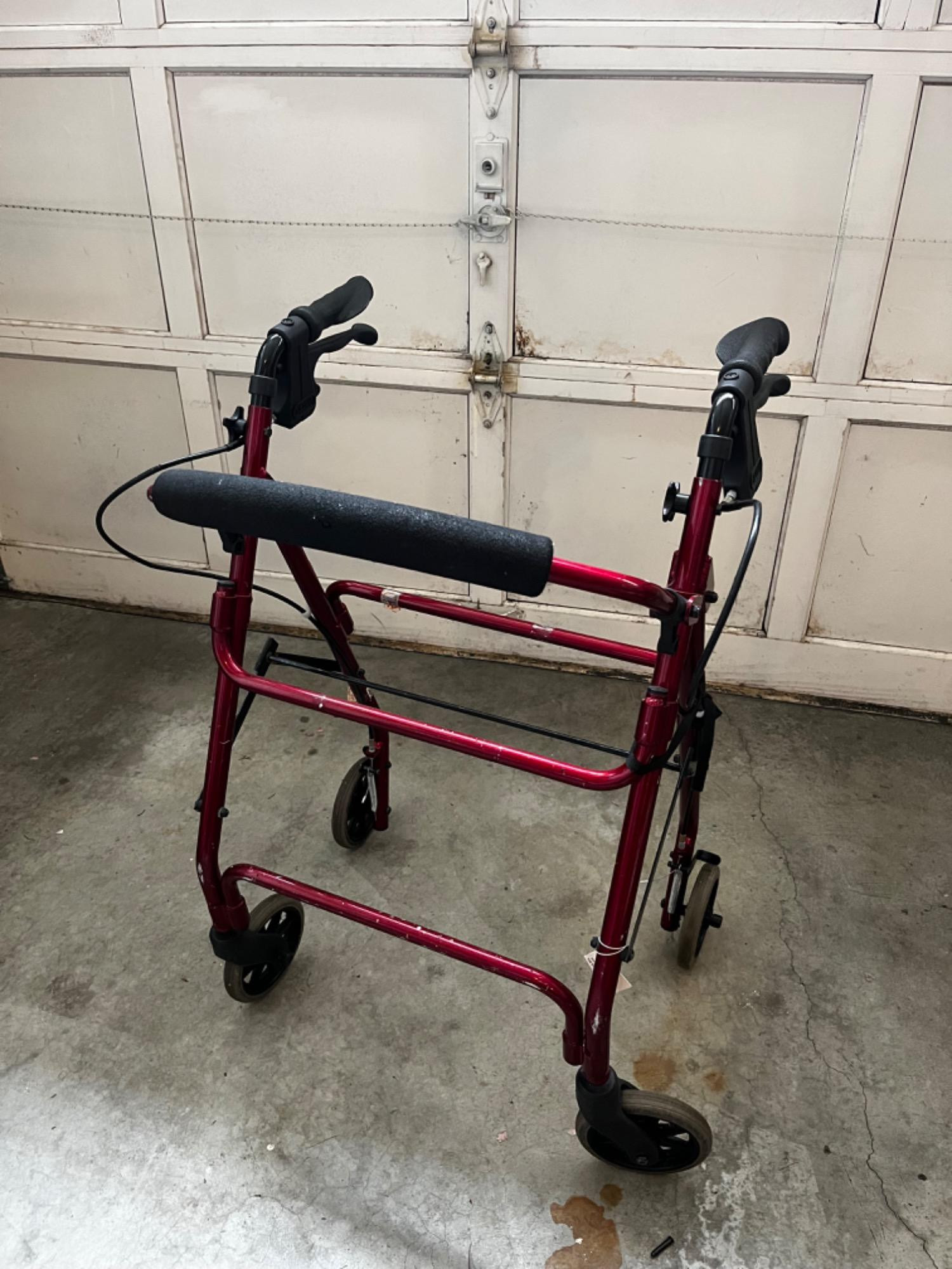 Measurements: 20 inches x 23.5 inches 32.5 inches Missing paint on support bars. Sturdy and opens and closes just fine. Breaks look to be deteriorating. No seat.