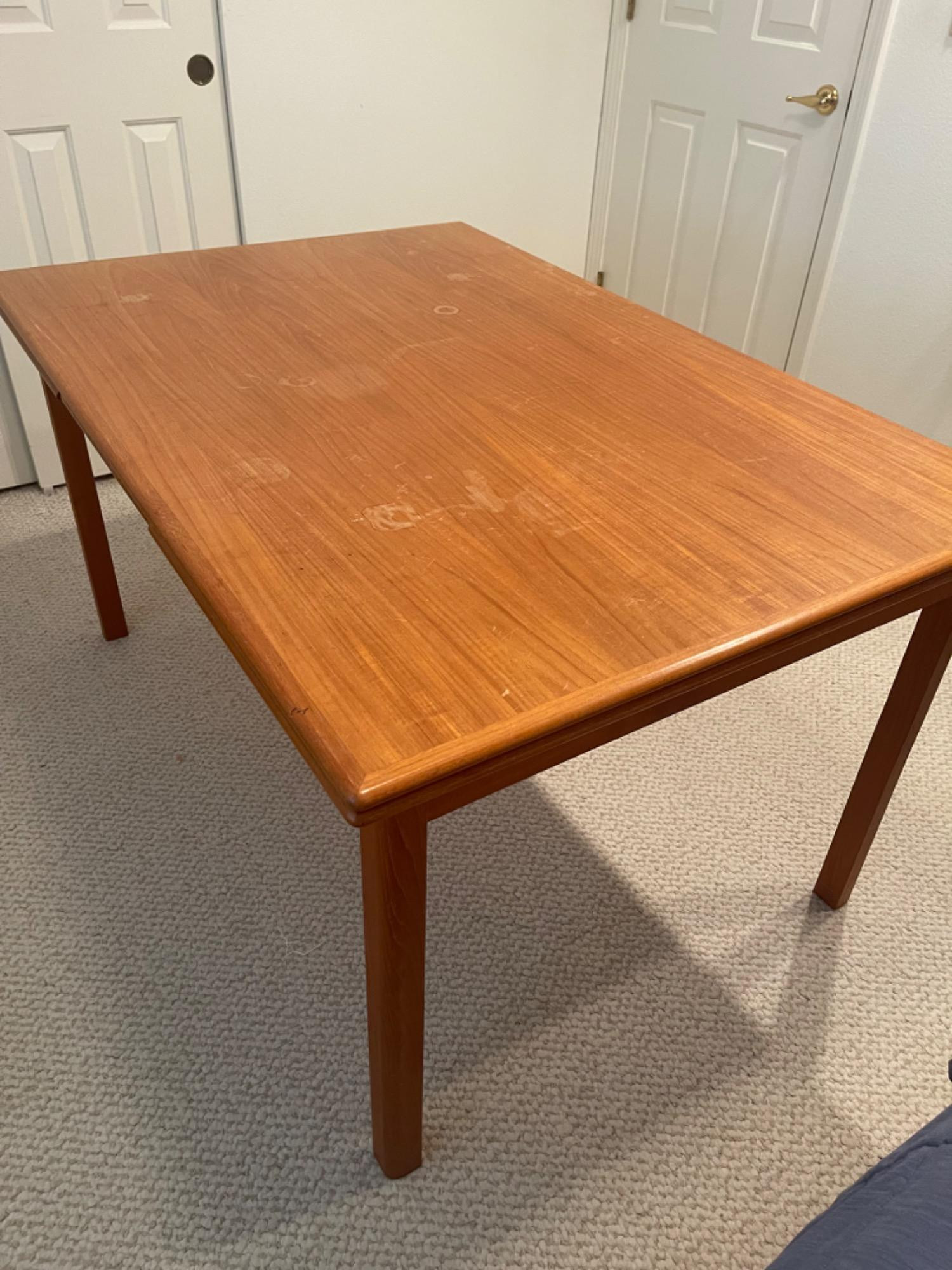 Measurements: 55 inches L x 37.5 inches W x 29 inches H Multiple stains and scratches to top Leaves in great condition. Probably teak veneered. Bidding on this lot is an agreement that: (1.) You will have 2 capable, able bodied persons to lift and load at a minimum. (2.) You will bring a hand truck and/or any other tools needed to remove this item. If these steps are not followed your item will be forfeit and no refund given.