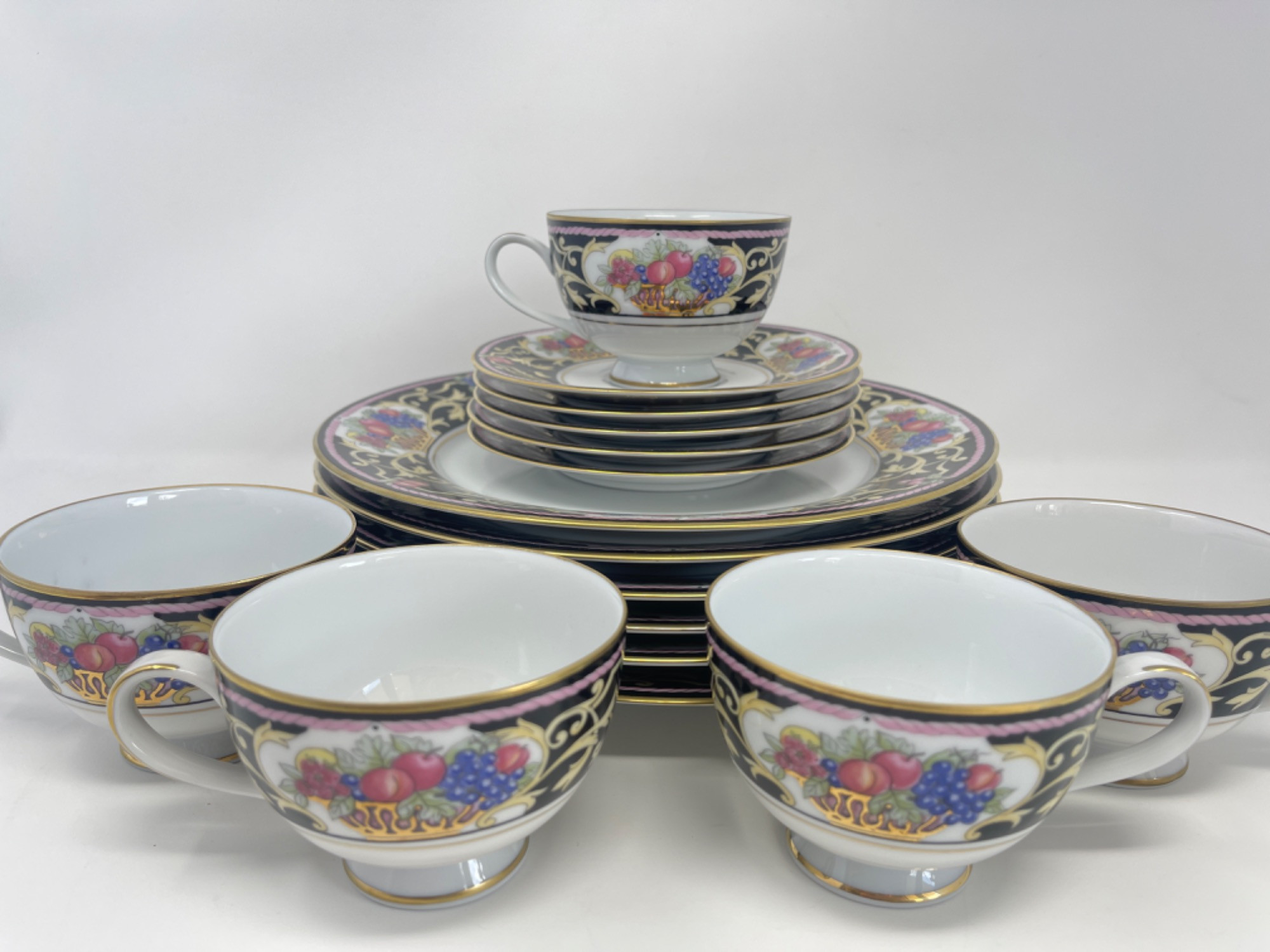 (6) Dinner Plates: 10.5 inches wide (5) Saucers: 6.25 inches wide (5) Tea Cups Great condition, no large chips.
