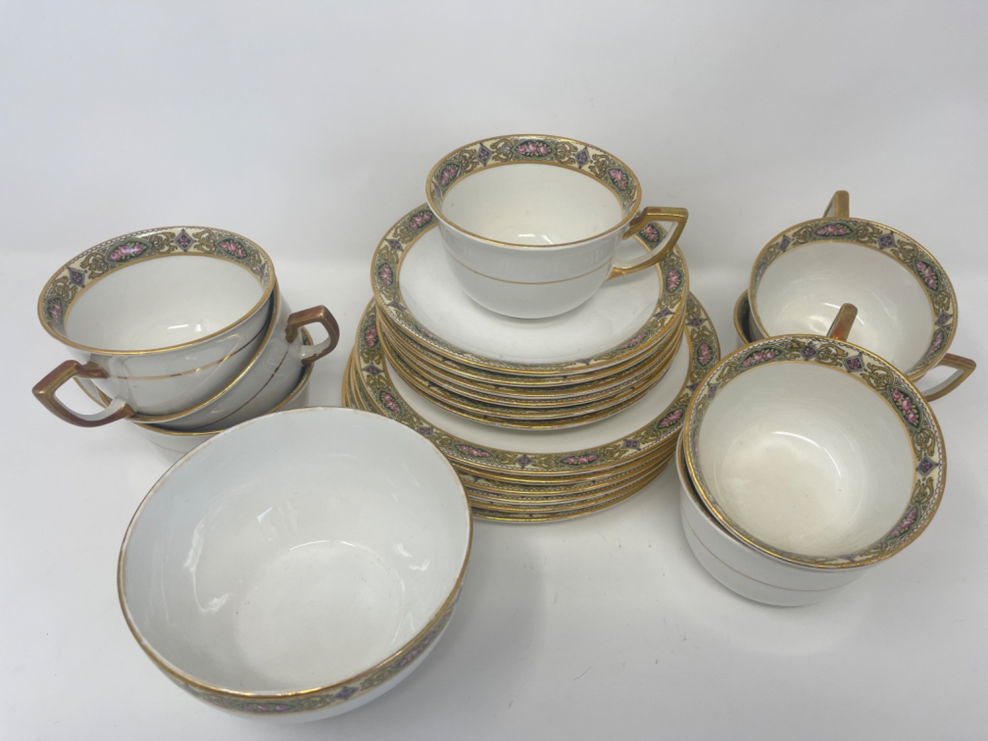 Some plates and cups have internal cracking, but no large chips. (6) Dessert Plates: 7 inches wide (6) Saucers: 6 inches wide (8) Tea Cups (1) Small Bowl