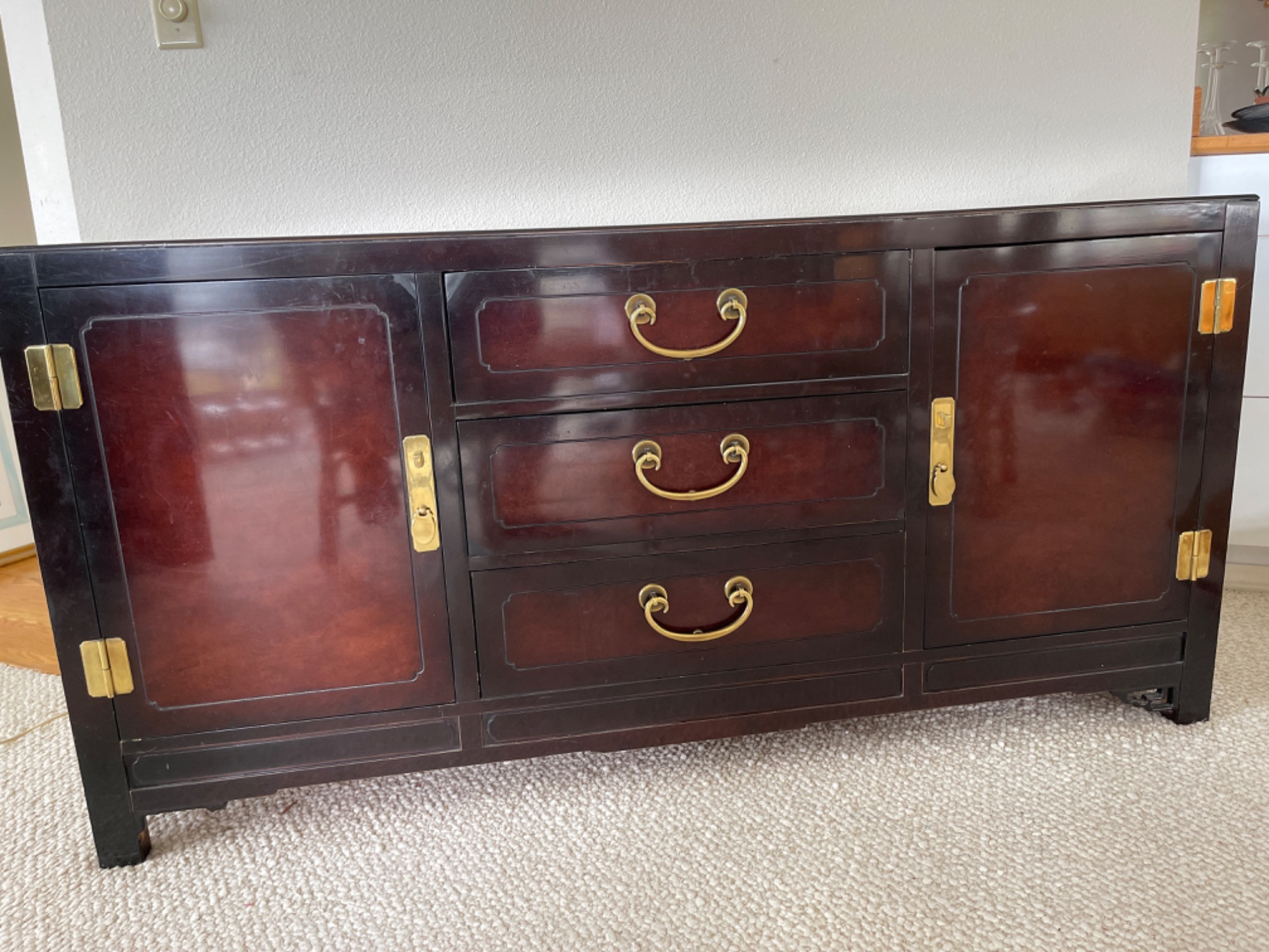 Measurements: 64 inches wide x 18 inches deep x 31.5 inches tall Good condition, some scratches and scuffs from years of wear. There is a flatware insert, but it is not attached. Bidding on this lot is an agreement that: (1.) You will have 2 capable, able bodied persons to lift and load at a minimum. (2.) You will bring a hand truck and/or any other tools needed to remove this item. If these steps are not followed your item will be forfeit and no refund given.