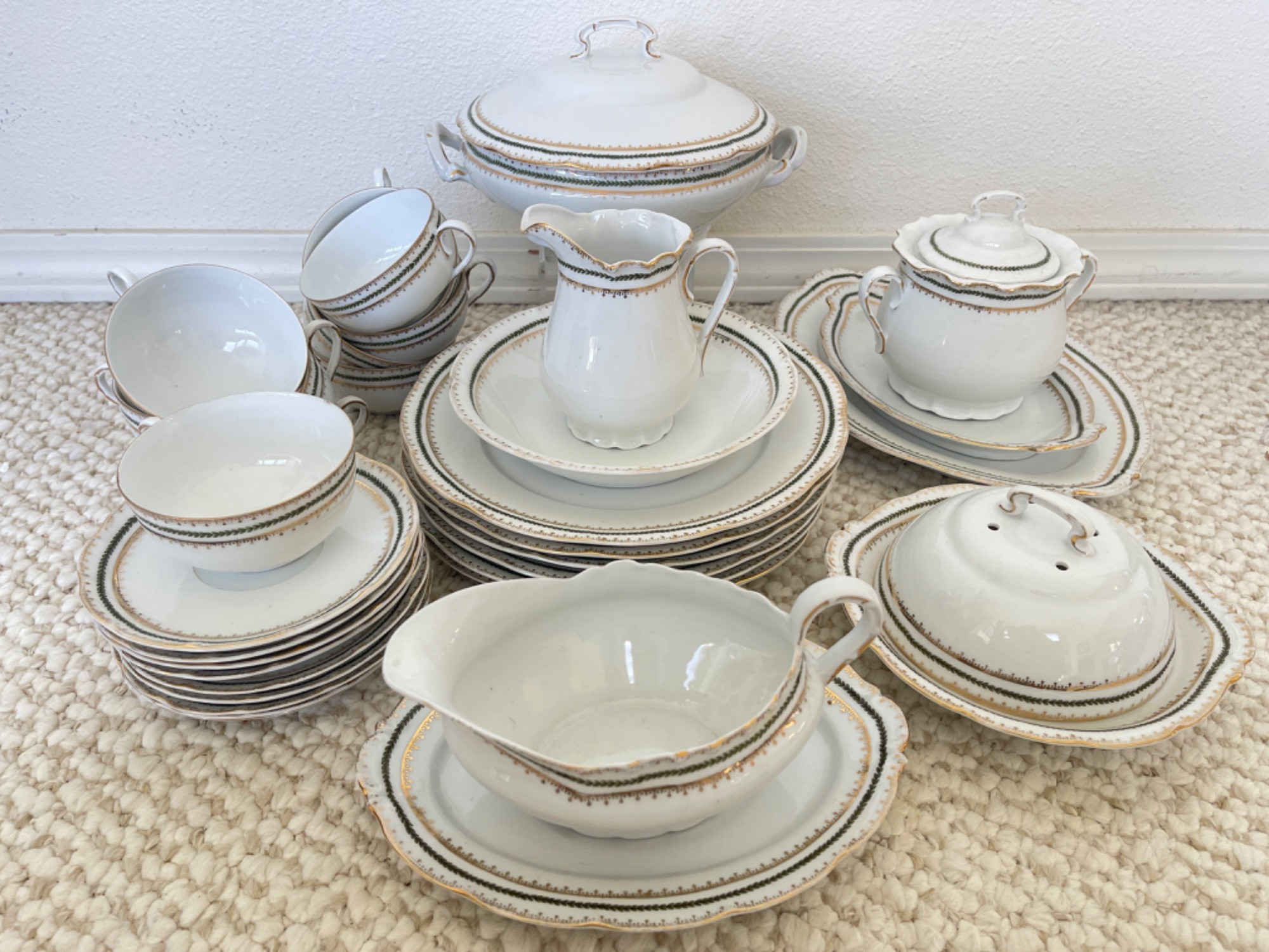 (6) Dinner Plates: 9.75 inches wide (9) Saucers: 5.5 inches wide (10) Tea Cups: 2 inches tall (1) Large Serving Platter: 12 inches wide (1) Small Serving Platter: 9 inches wide (1) Serving Pot: 9 inches wide (1) Dinner Bowl (1) Creamer (1) Sugar (1) Gravy Boat (1) Gravy Boat Dish (1) Butter Dish A couple of small chips to tea cups. Some minimal staining, as well as rubbing off of the design to a few pieces.