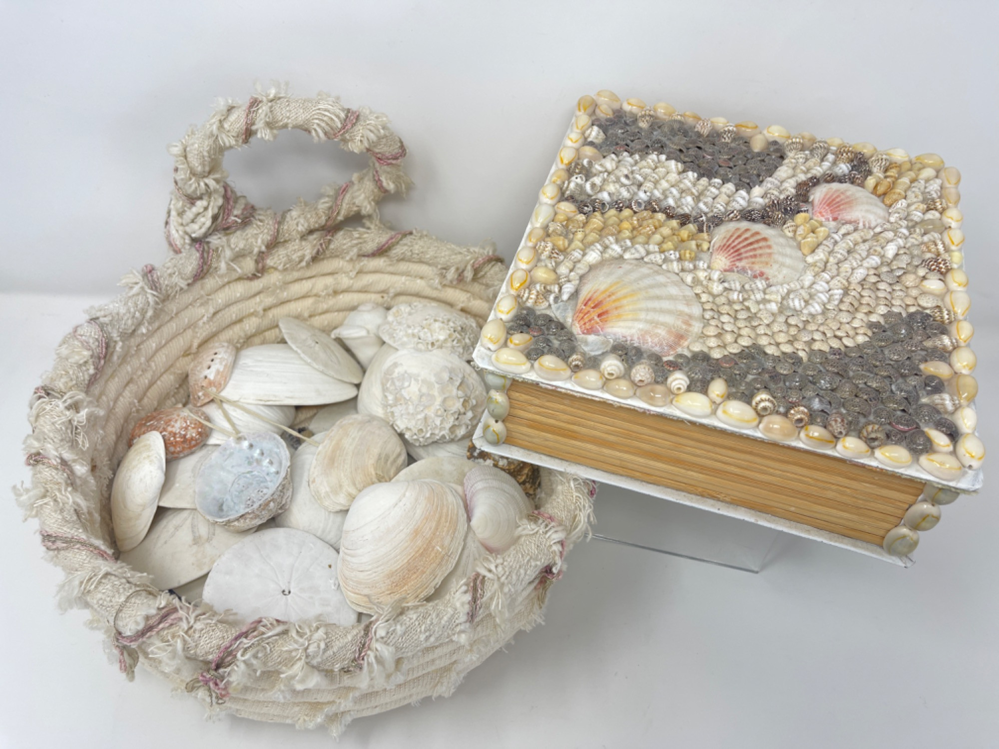 Lot # 151 - Seashell Jewelry/Trinket Box & Woven Basket Full of Shells/Sand Dollar