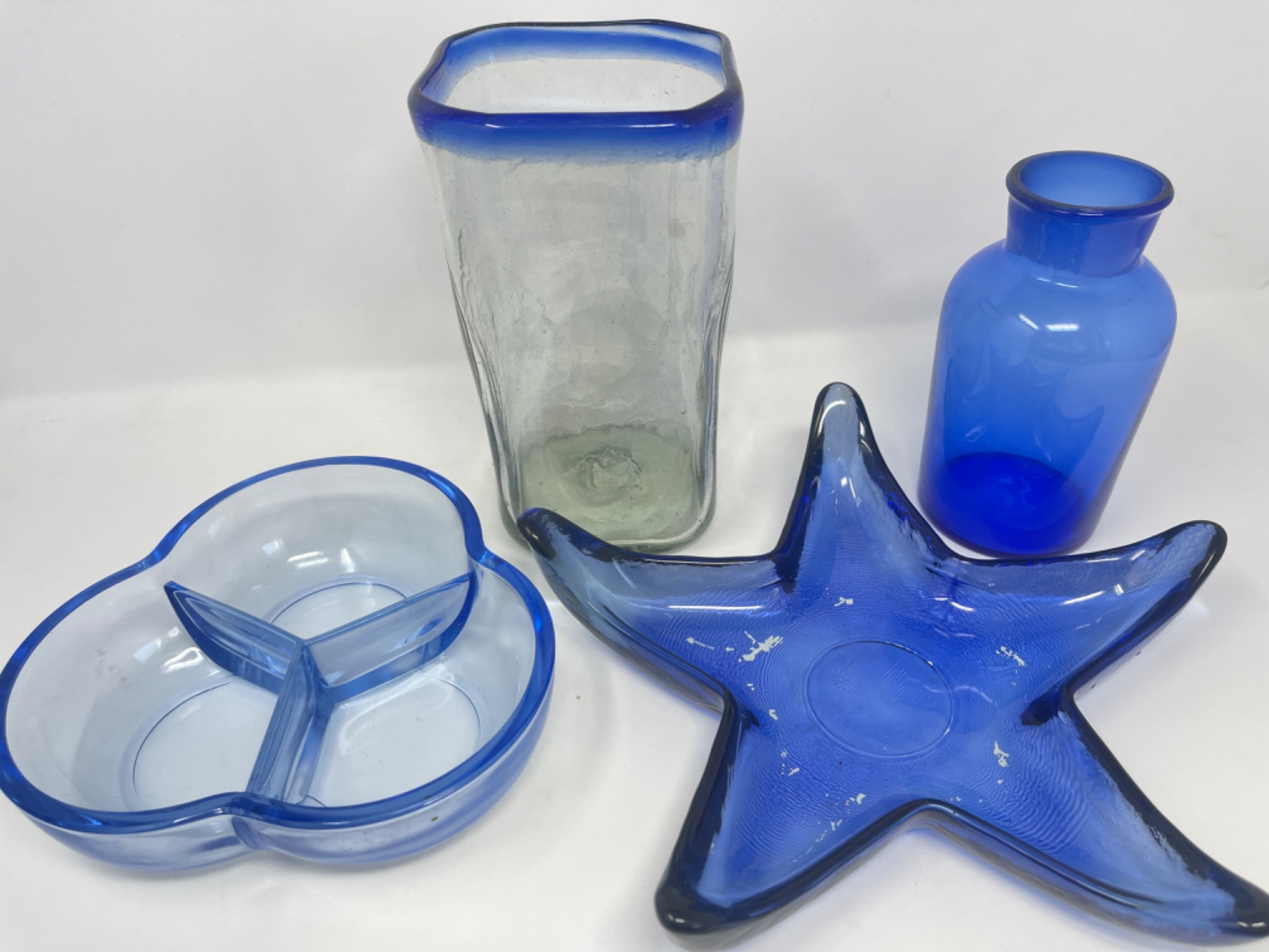 Blue Starfish: 10.5 inches wide - Blue has come off in some places in base of tray. Three Sectioned Tray: 7 inches wide Blue Vase: 6.25 inches tall - THICK PLASTIC - Not glass. Clear/Blue Vase: 8 inches tall