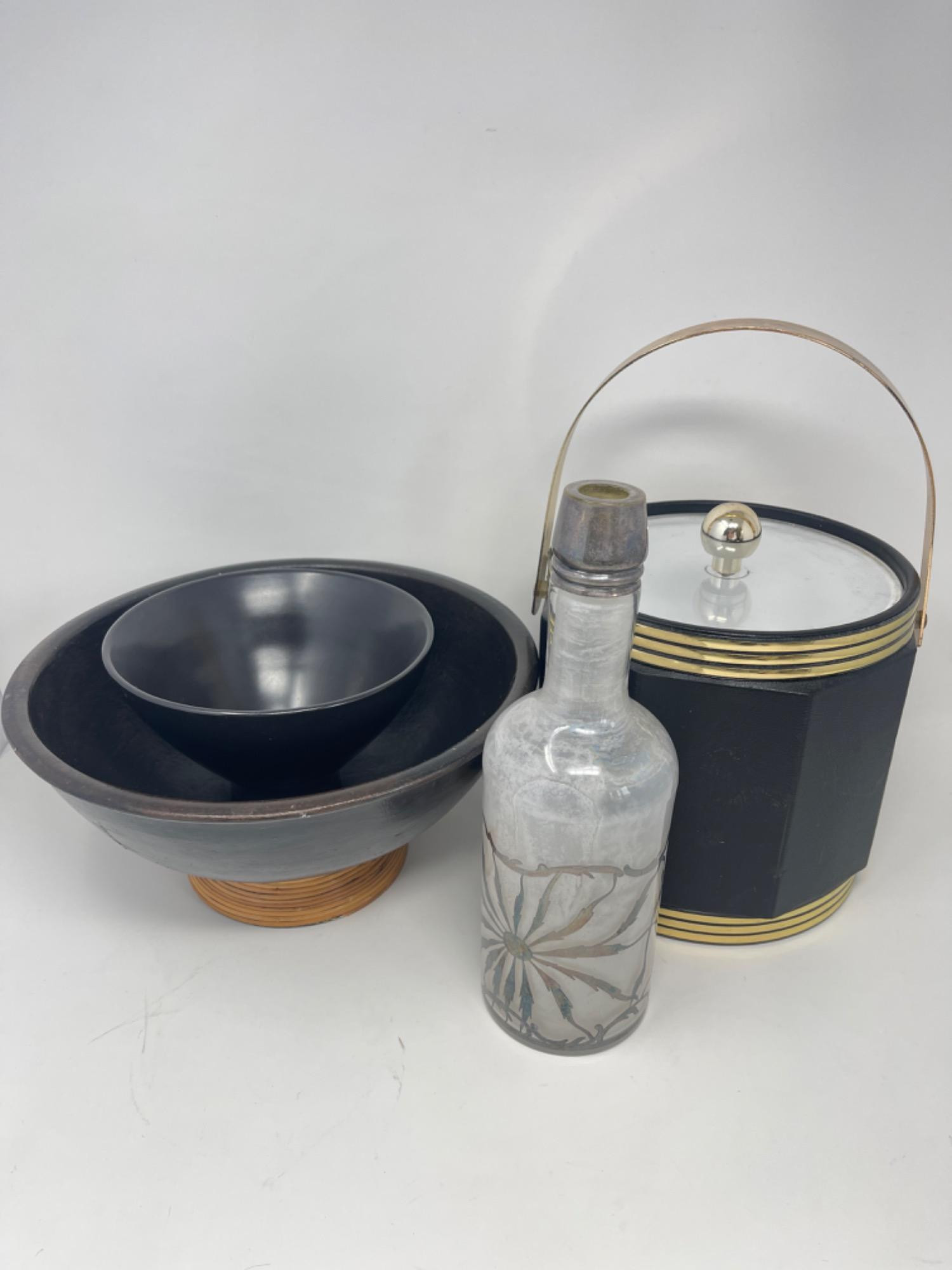 Lot # 200 - Assortment of Modern Black Bowls, Ice Chest and Art Bottle