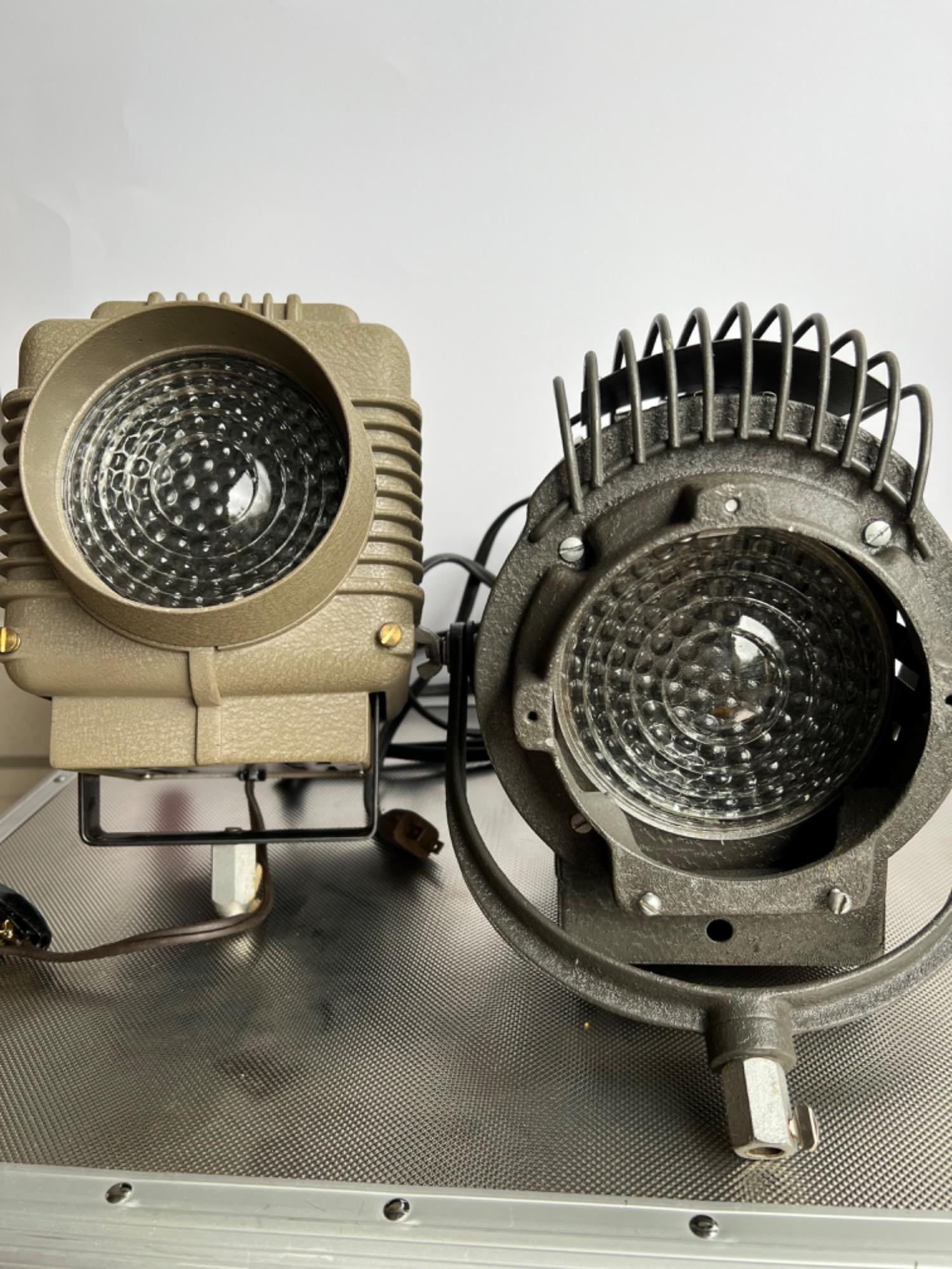 Vintage Naren Pro-Spot movie spotlight with Fresnel Lens 500 Watt. The Naren Pro-Spot Model N-102 was made in Chicago, circa late 1940s to early 1950s. Industrial looking light! Features a cast aluminum body finished in grey wrinkle paint, larger 4-1/2" Fresnel glass lens and light bulb slides on a rail for rapid focus. Serial No. 3383. Nice smaller size, measures about 10x10x7. Great for movie/studio/performance lighting or for vintage collection. Note that there is an electrical repair that is needed for the on/off switch wired into the electrical cord. Included is an unbranded vintage spotlight. Lights have not been tested. ELIGIBLE FOR SHIPPING.