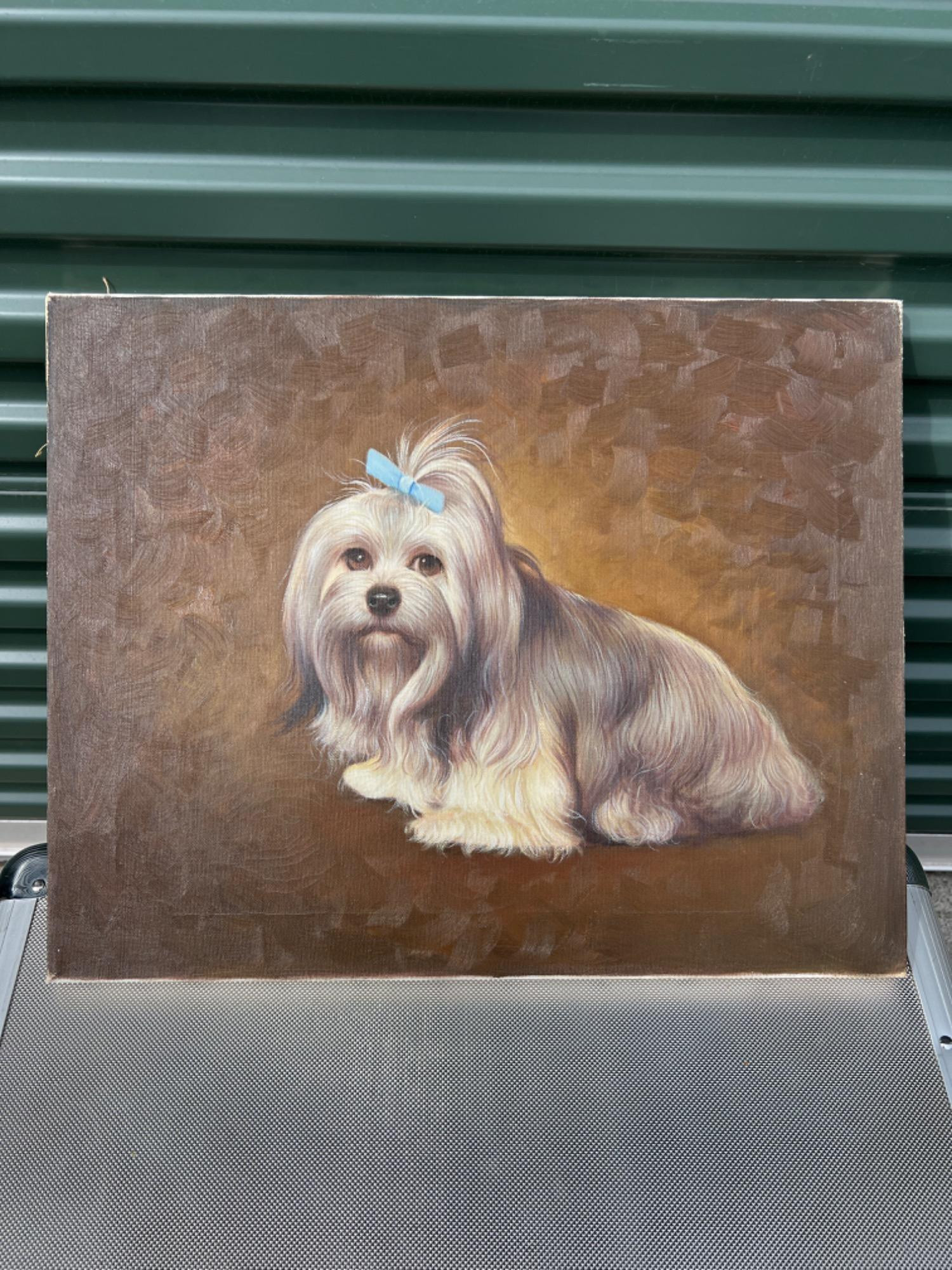 Not much information about this painting other than it is an unknown artist oil painting on canvas of a Maltese dog. Dated 1983?