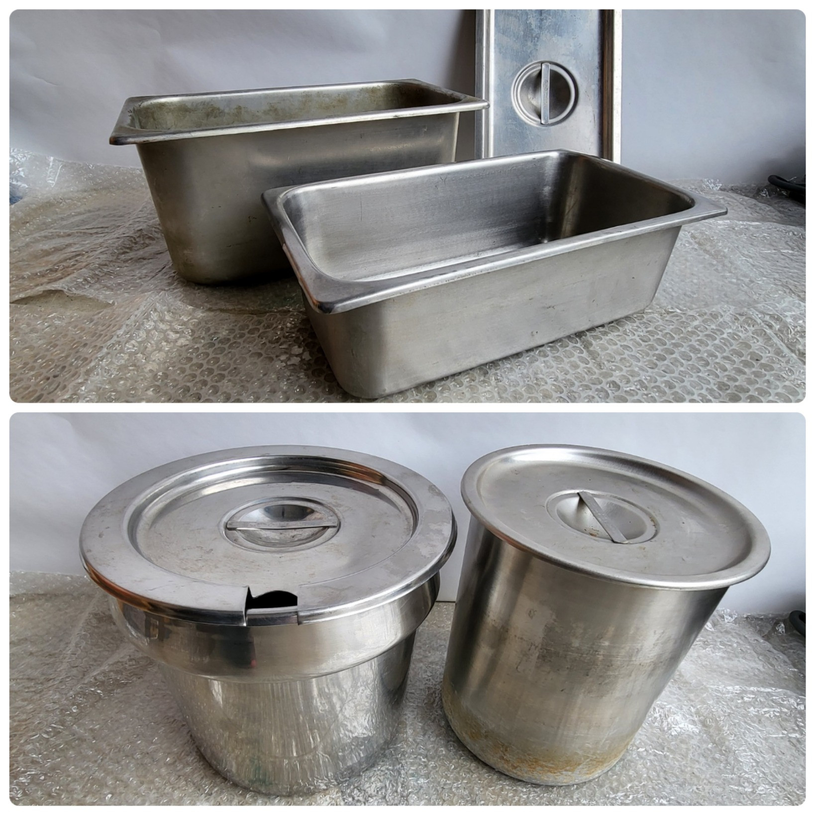 9" x 8" and 8.5" x 9" round steam table soup pots with lids. 4" high and 6" high 1/3 steam table pans, one lid.