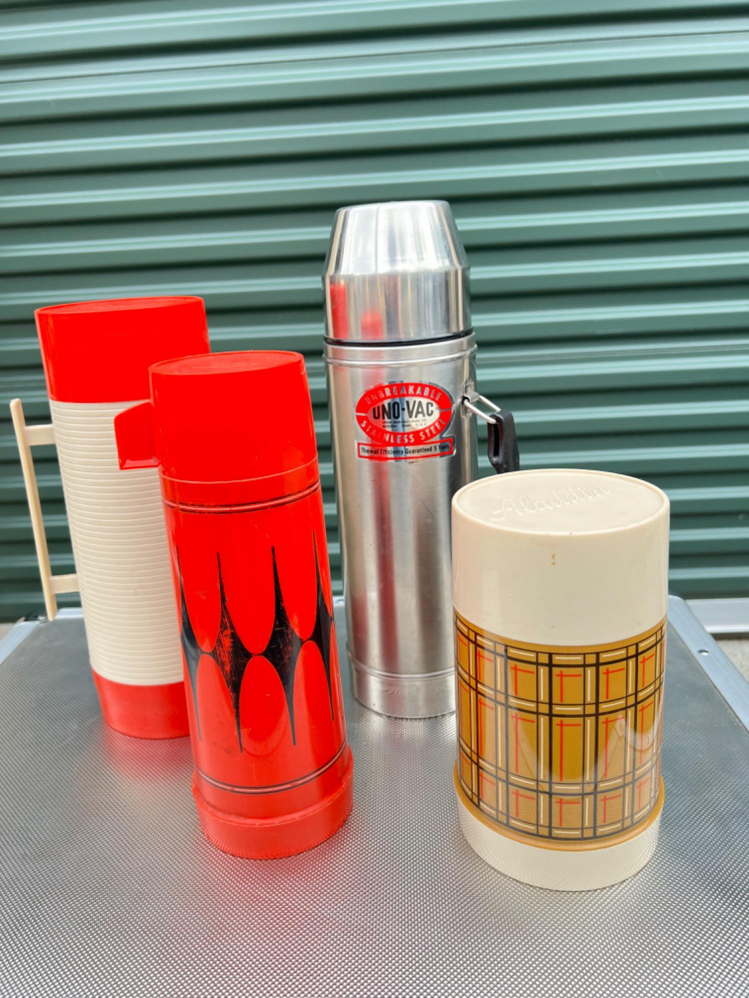 Retro Aladdin thermoses and a stainless steel Uno-Vac with handle. All four are in very good condition.