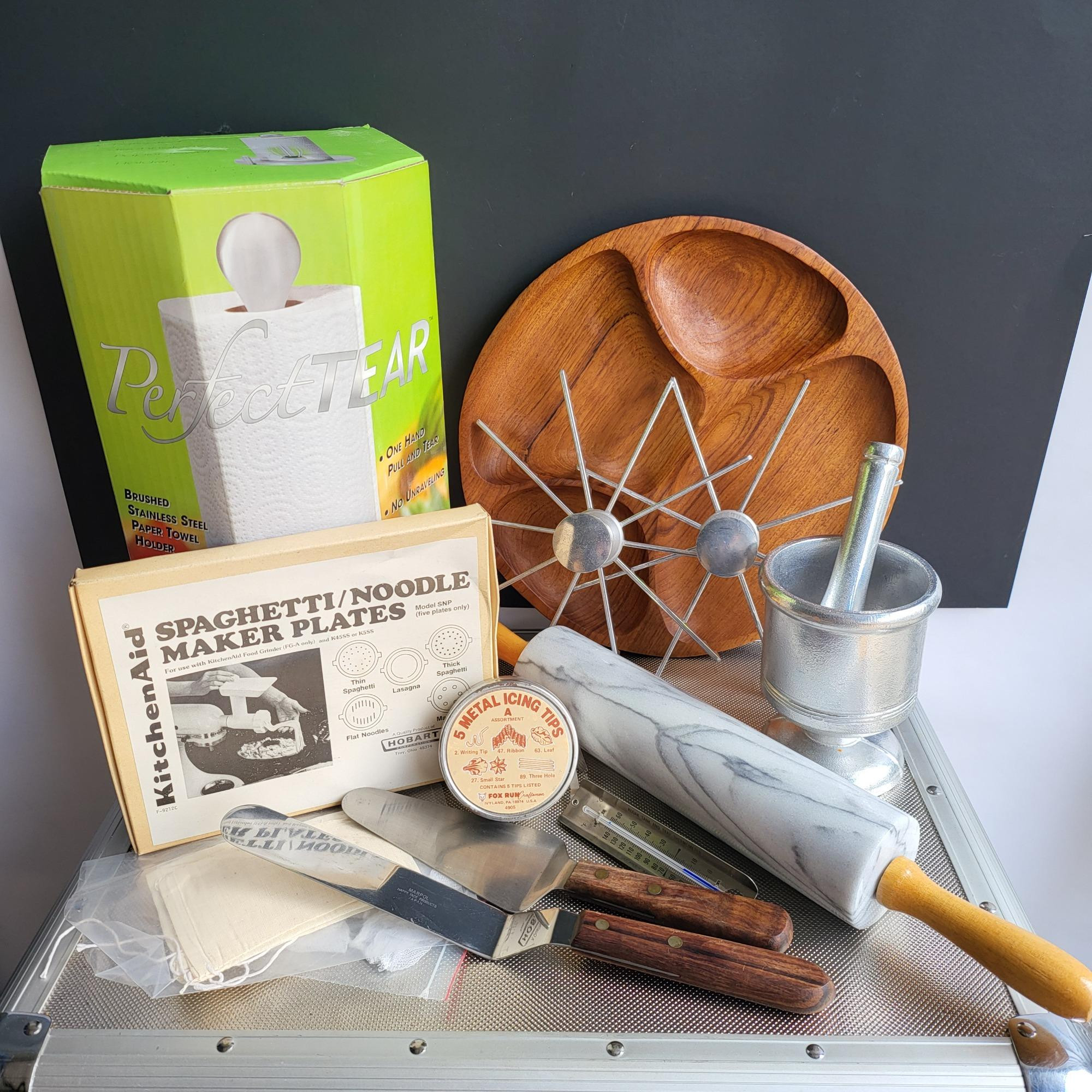 Halco pie server, Mapol icing spreader, NIB paper towel holder, heavy marble dough roller, two pie scorers, 12" teak tray and more.