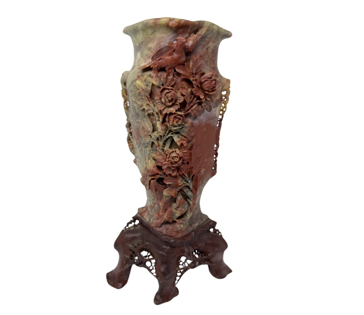 Carved by hand from soapstone. Acquired in Japan. Vase is 16” high x 6” wide x 4.5” deep. Flatter at back of vase. Exquisitely crafted with a 3D carving of flowers and a bird. Sits on a wooden three- legged hand carved stand.