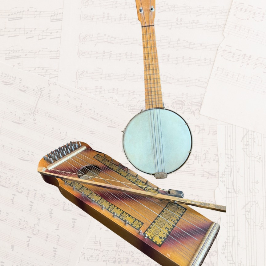 Vintage banjo (no maker mark, patent pending mark) 20" long Vintage Violin-Uke Ukelin instrument with bow (a few strands are frayed). 20" long. Both instruments have all strings. Uke is in original box with printed instructions on how to play. Banjo is in a soft case.