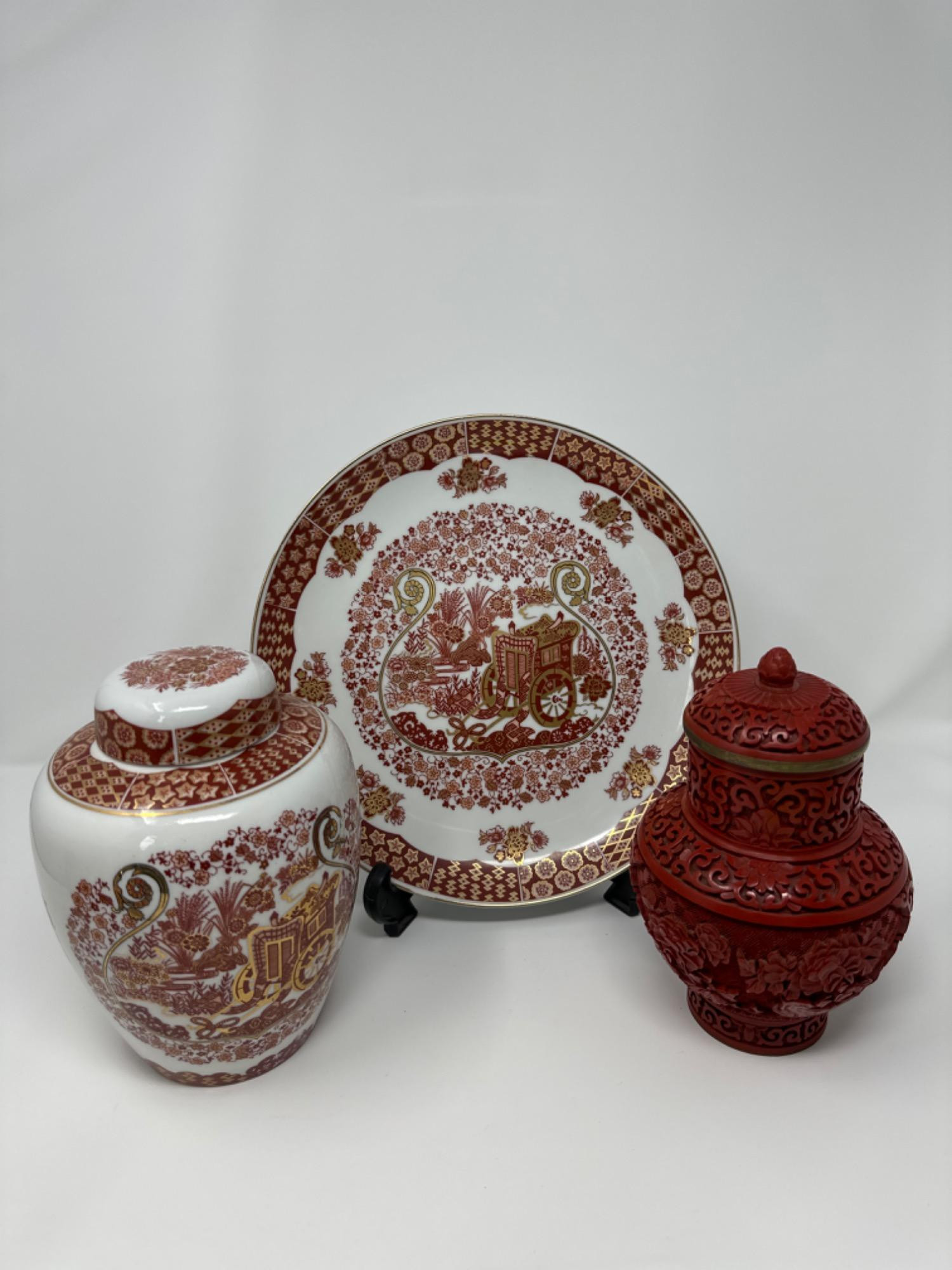 Lot # 42 - Ginger Jar, Plate and Hand Carved Cinnabar Ginger Jar