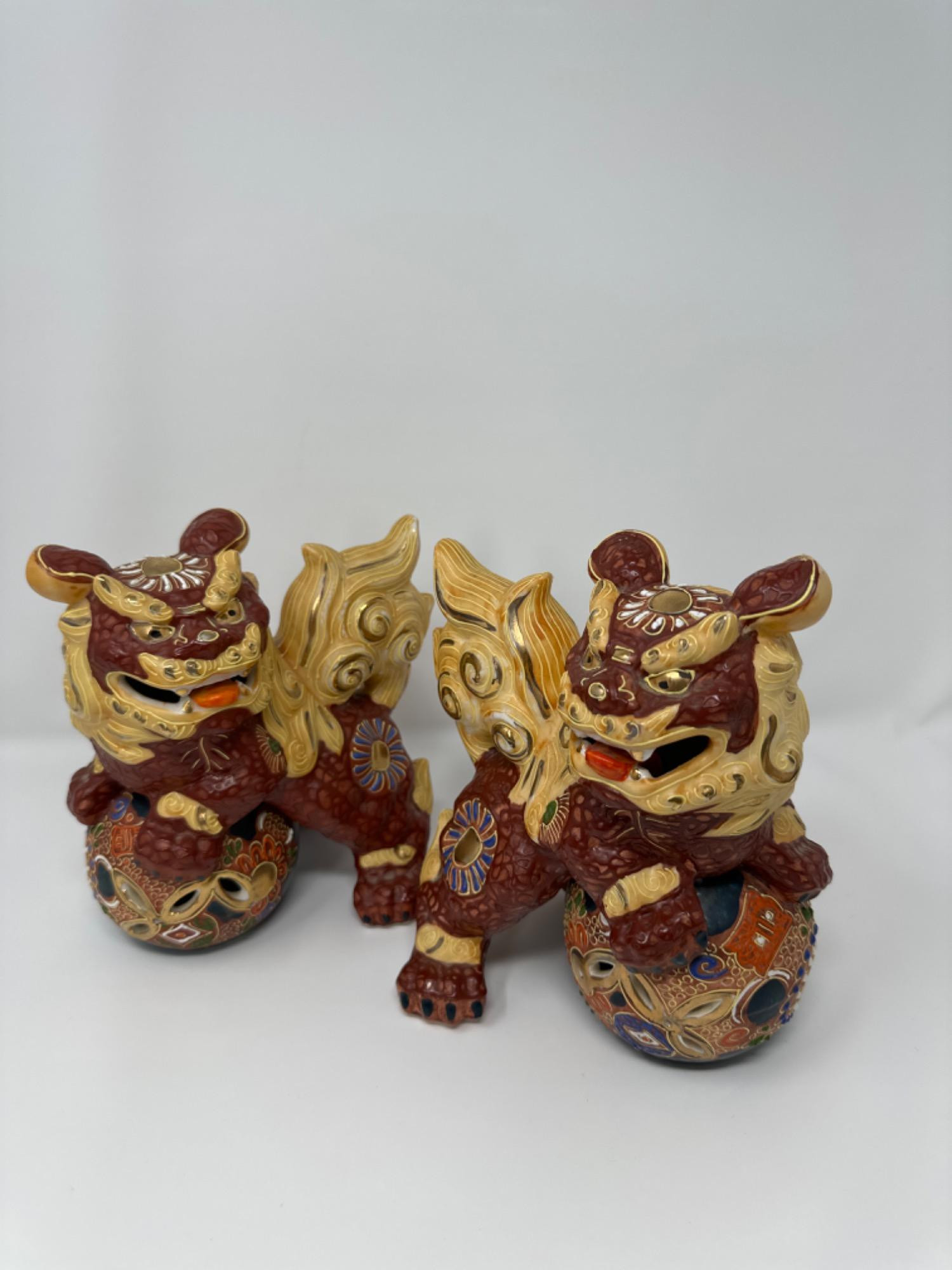Pair of Mid-Century Kutani Ceramic Polychrome Japanese Shishi Komainu Foo Dogs. Great pair of mid-century polychrome glazed ceramic shishi (lion) foo dogs. Shishi is translated as "lion” and it's believed that has magical properties and the power to repel evil spirits. Shishi posing on the ball also means blessing and the meaning of this scary face is to repel evil spirits. 7T x 6 W