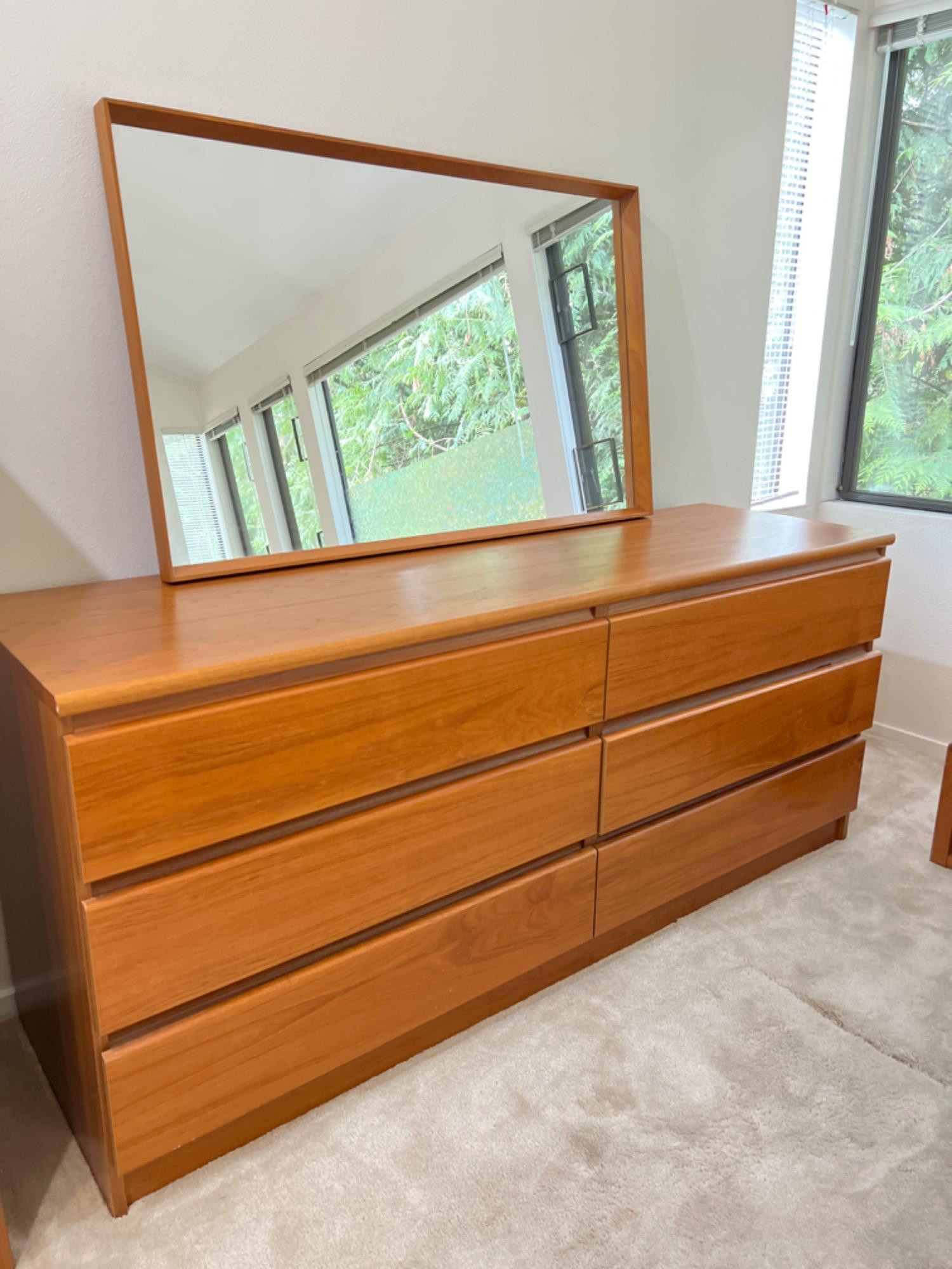 Excellent mid century modern condition. Dresser size: 66” x 20” deep x 28” tall Drawers: 33” x 7” tall Mirror: 44” wide x 28” tall x 2” thick. Mirror is removable. Bidding on this lot is an agreement that: (1.) You