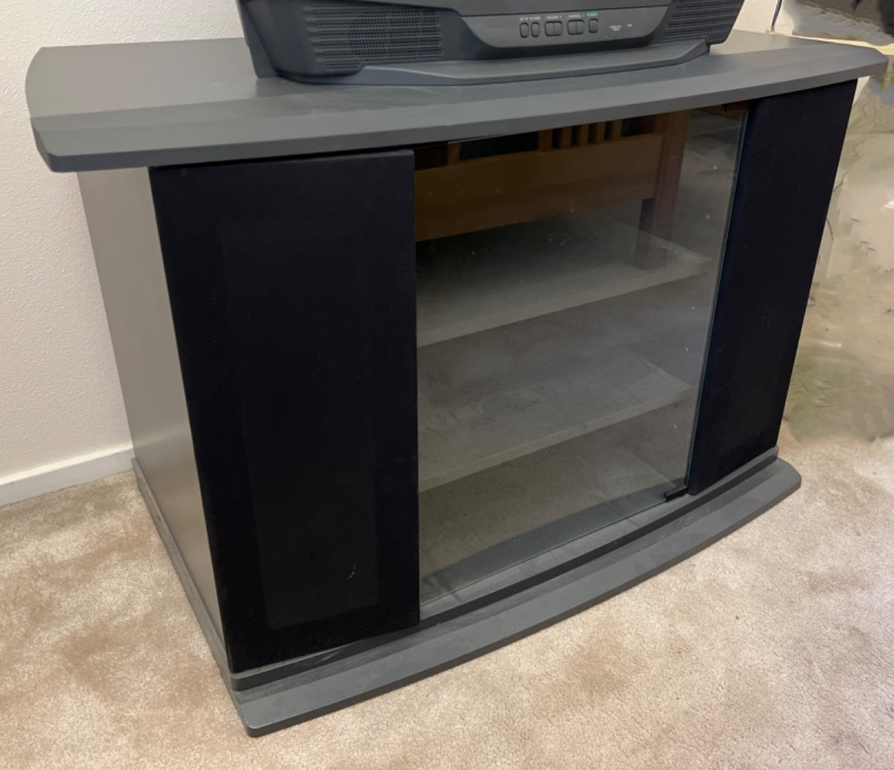 Stand with lower cabinet. Center smoky colored center hinged glass door and three shelves and mesh side doors with space for speakers or game systems or hidden media storage. Swivels. Size: 40.5” wide x 21.5” deep x 25.5” tall Bidding on this lot is an agreement that: (1.) You