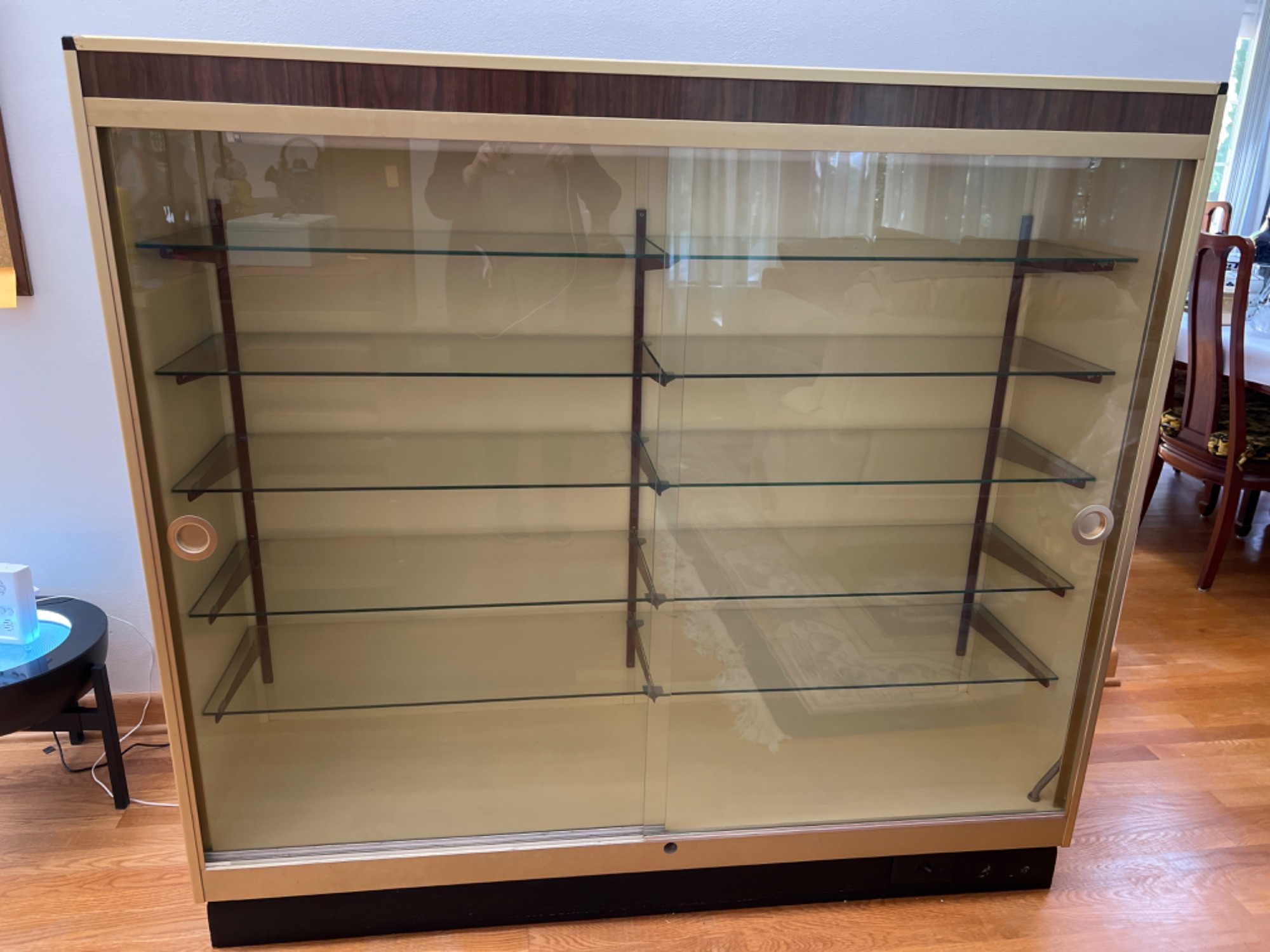 Vintage Glass Front/Shelves Lighted Display Cabinet. Cabinet 59” long x 18” deep x 54” tall Bidding on this lot is an agreement that: (1.) You