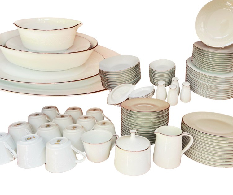 Noritake Reina Pattern China Set in beautiful vintage condition. 12 Dinner plates - 10.5" round 12 Salad plates - 8.25" round 12 Bread and Butter plates - 6-3/8" round 14 Saucers - 6" round 14 Teacups - 3" tall 2 sets of salt and pepper shakers 6 ashtrays Creamer and sugar bowls Large serving bowl, two platters, medium serving bowl, and gravy pourer with resting plate.
