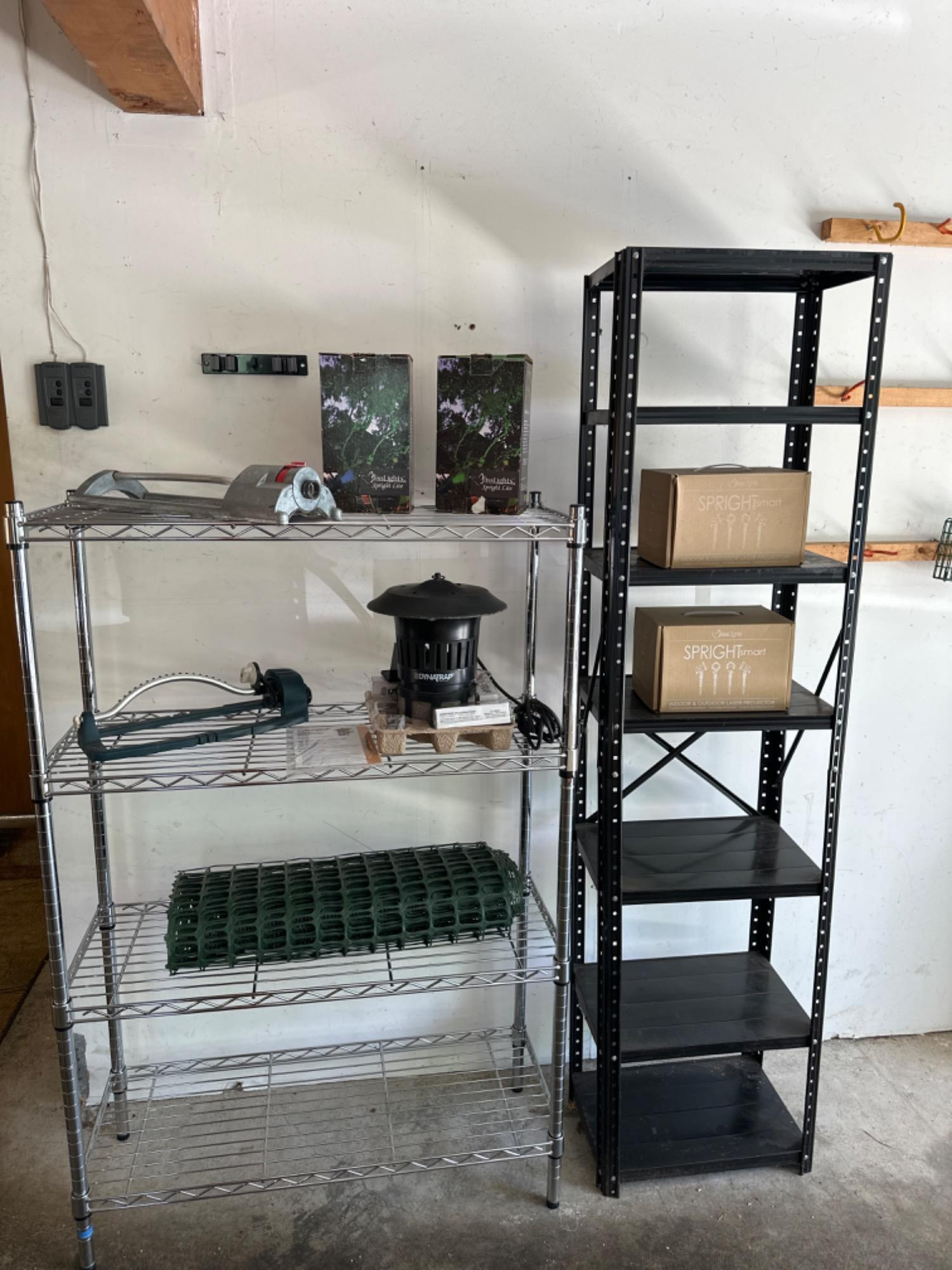 Smaller of the two shelves measures 70 1/2" tall by 17 1/2" wide by 11 1/2". Chrome shelf measures 35" wide and 14" deep x 53 1/2" tall and appears to be Costco brand. There are also four boxes of outdoor lighting which appears to have never been used. Please see details a trap insect trap that looks to be new some netting and two sprinklers.