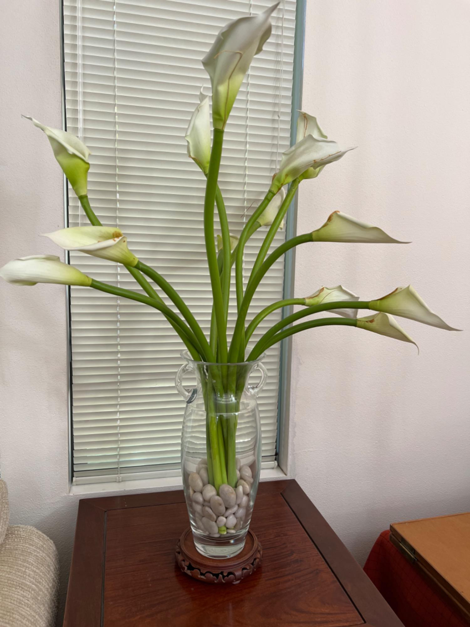 Arrangement is 36” tall x 29” wide. Sits on wooden base. Beach rocks at bottom of base. Calaliles are removable