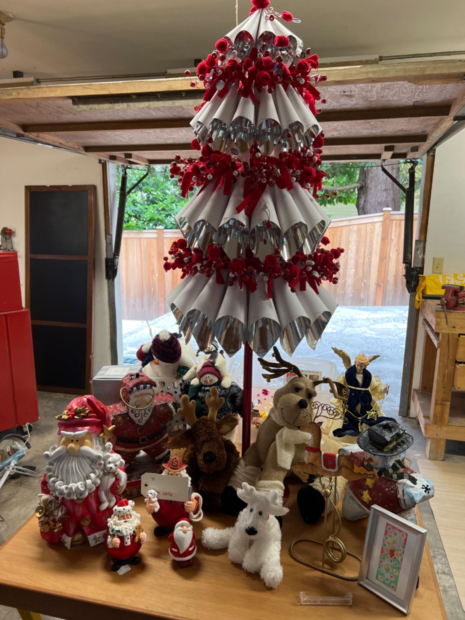 Tree stands 48” tall x 14” diameter. It is an original Starbuck's Christmas celebration tree. Includes all the decorations, Santas, reindeers and more pictured on and under the table.