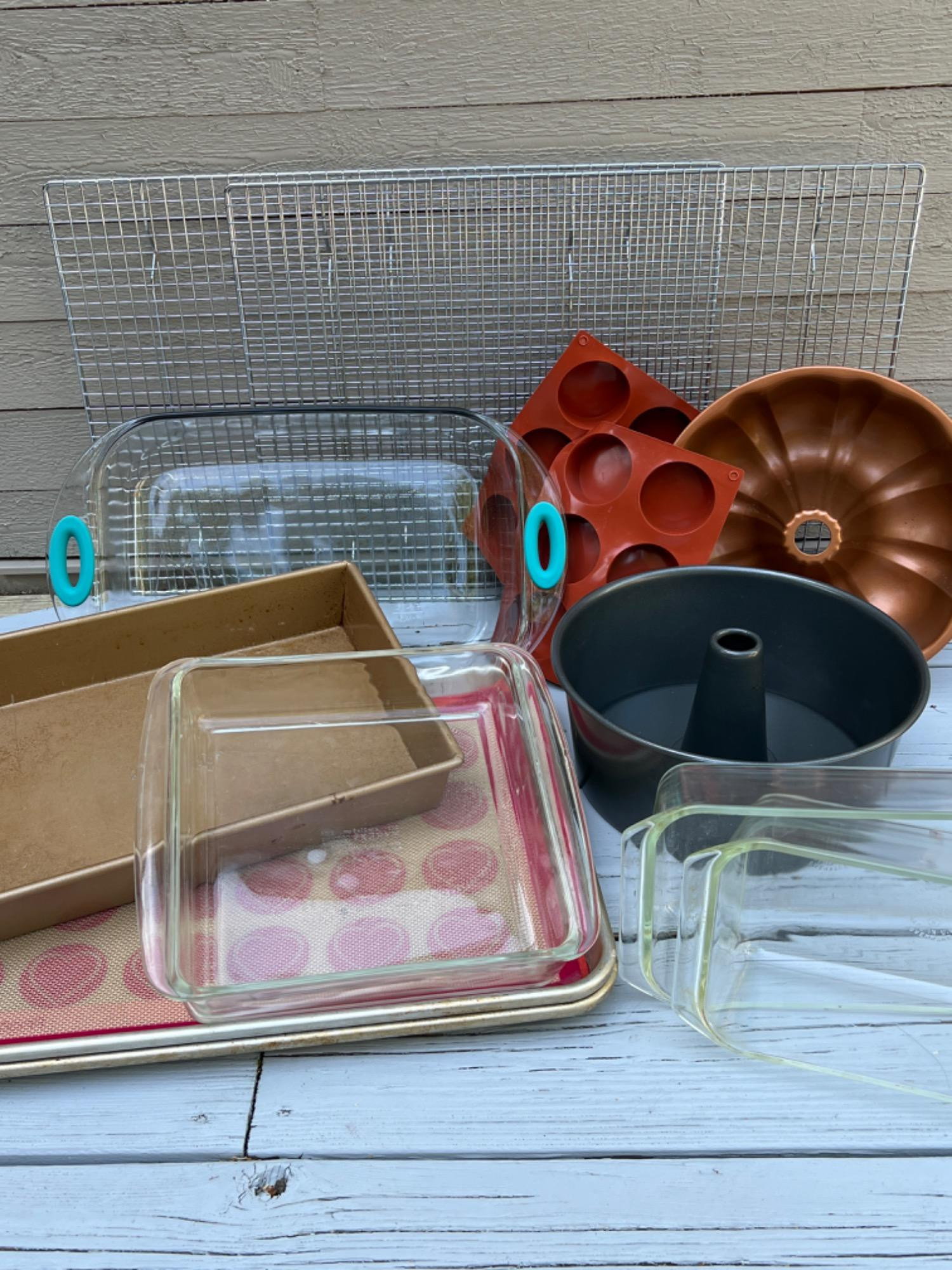 Racks are 21” x 14”. Baking pans: Bundt, Square, Rectangular, trays, silicone. Glass pyrex oven-proof loaf pans.