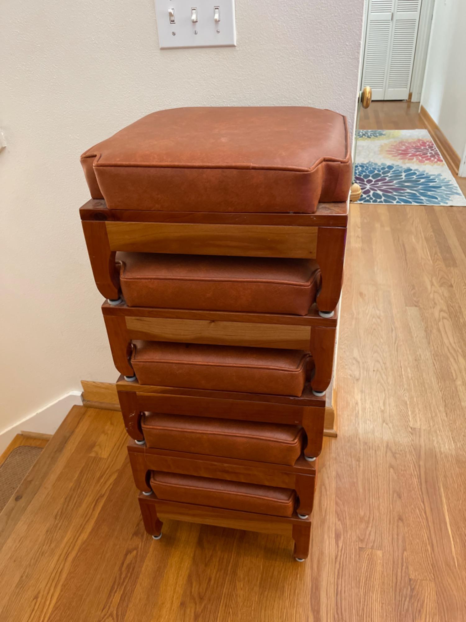 Five stacking stools with Asian flare, they measure 16.25 x 16.25 x 10“ tall.