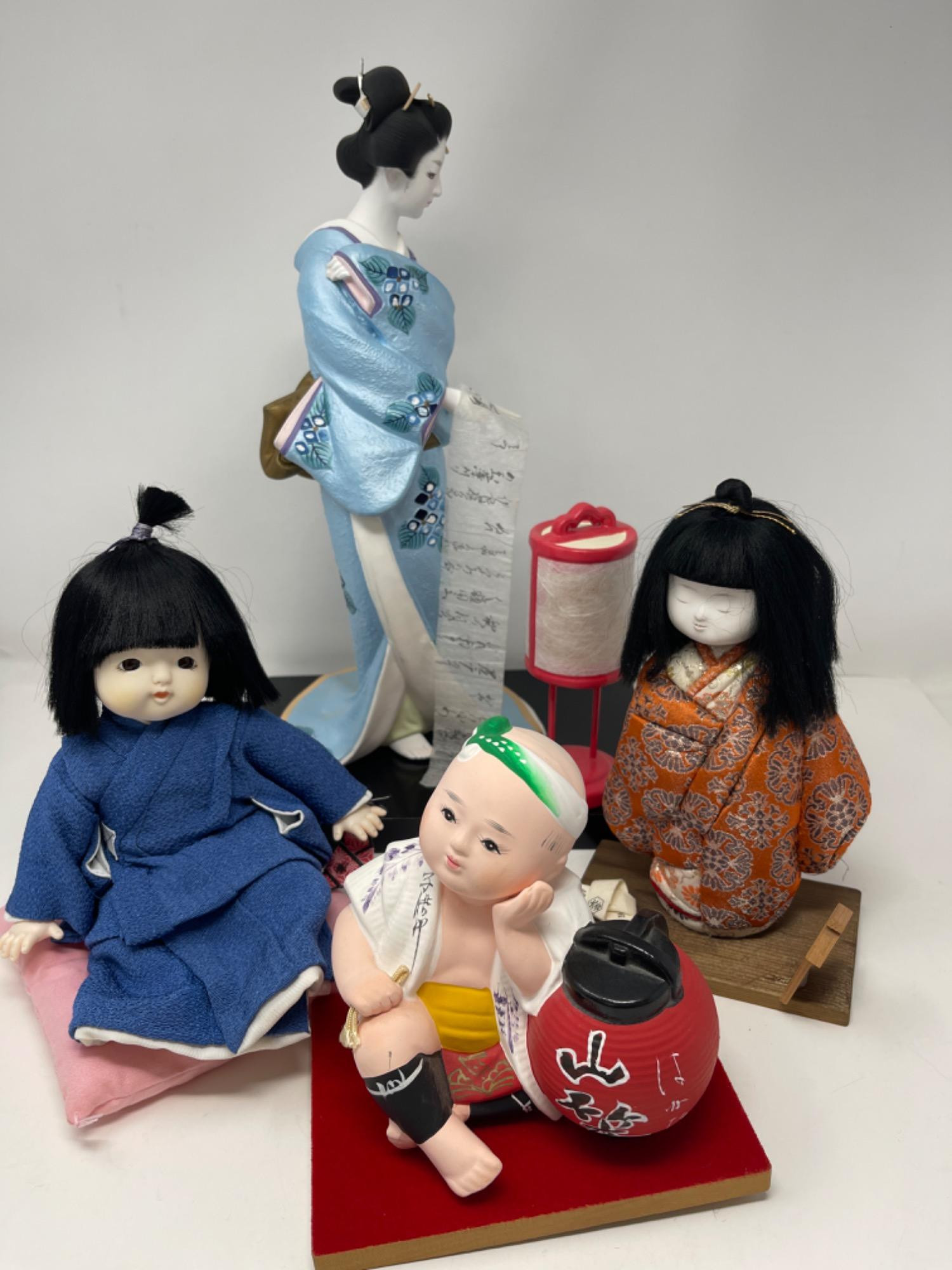15” Geisha Doll in light blue dress Three Smaller Japanese doll figures measure 6” to 8” tall
