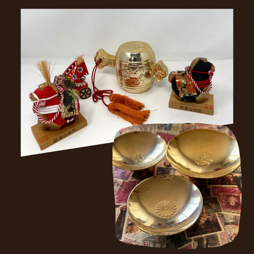 Lot # 156 - Daikoku Lucky Mallet, Japanese Folk Art Figures & 24 GP Saki Cups