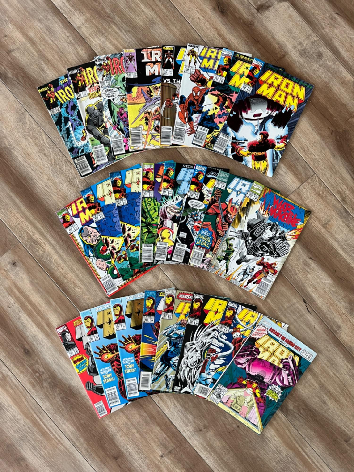A collection of Marvel's Iron Man comic book series. A majority of the comics are in relatively good shape. Although, #176 has lots of wear on the cover and spine, #192 has markings on the surface of the cover, and #201 has water damage on top of the comics. Despite that, they all have beautiful colors and are ready to be read!