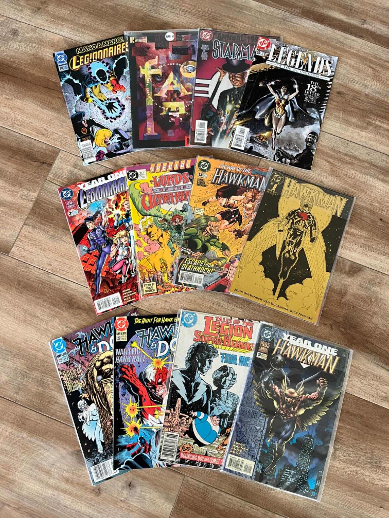 A collection of various DC Comic character series, including a unique gold-foil Hawk-Man cover! Conditions vary, but they are all good for reading with excellent coloring!