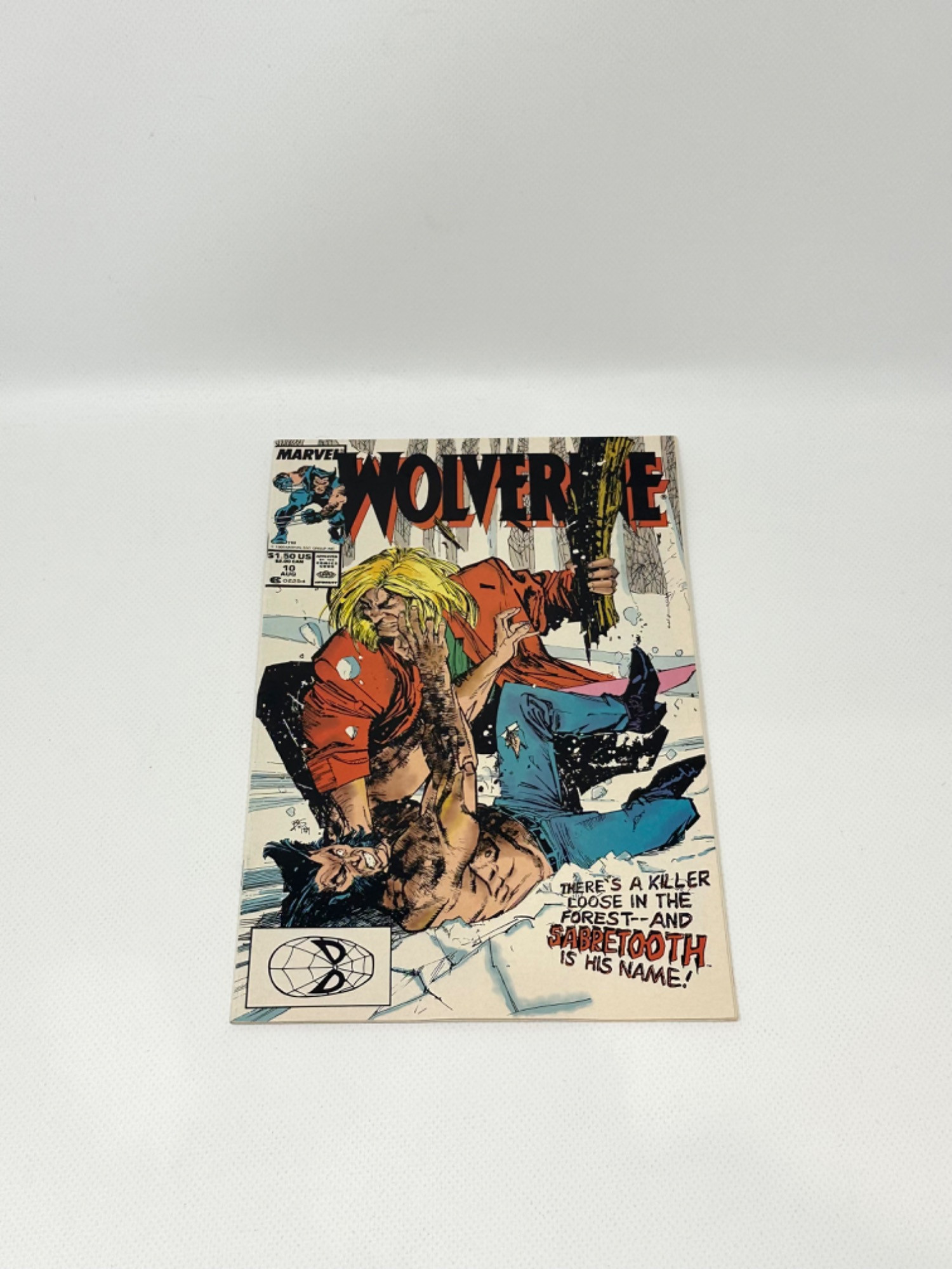 Listed is Wolverine #10, a popular Sabretooth vs. Wolverine comic book! Condition: This comic has a series of tiny tick marks alongside the spine, and some minor dents along the spine as well. It is roughly in FN/VF condition. Overall, in very solid shape and has beautiful bold and bright colors.