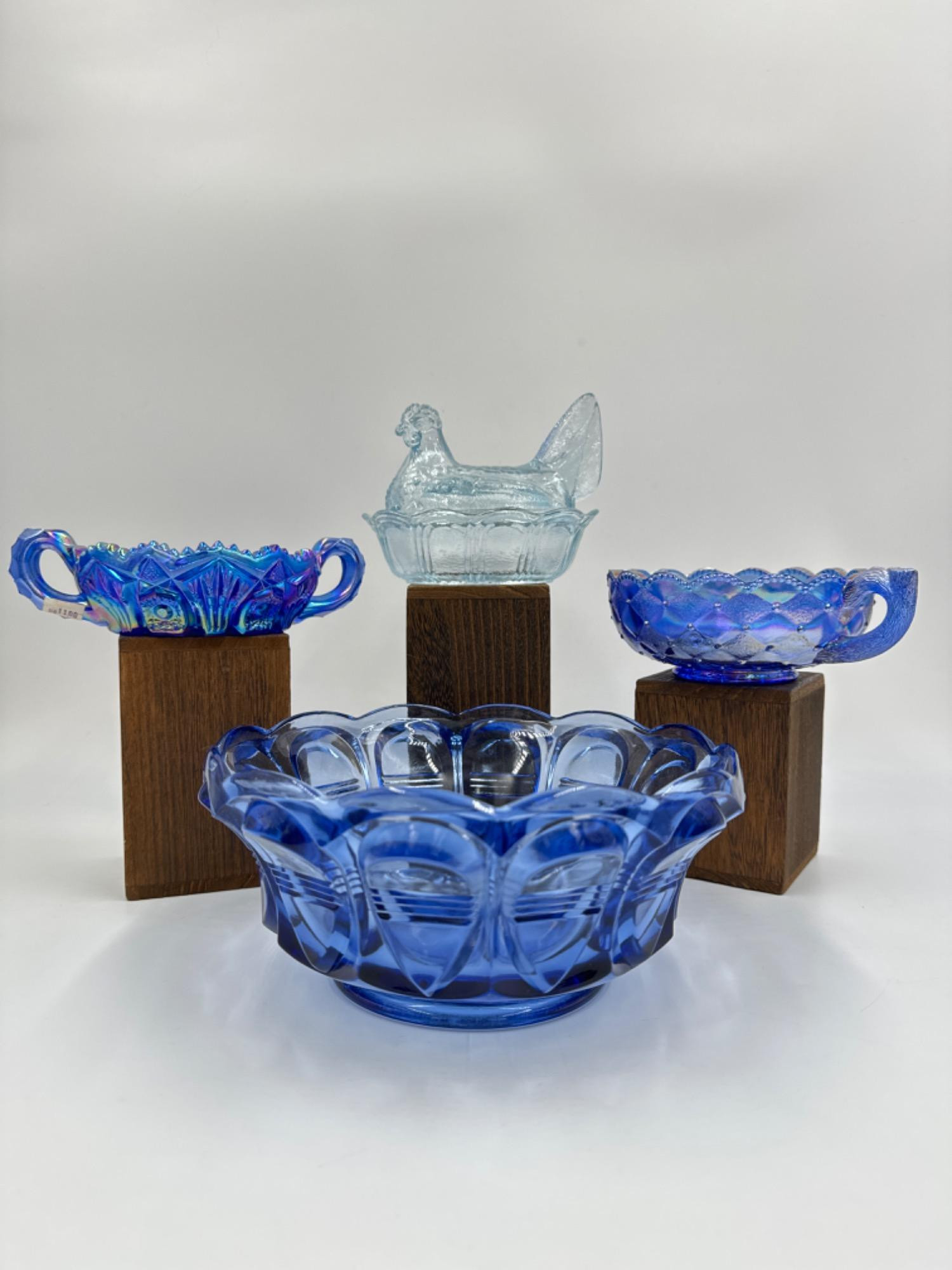 Fenton Periwinkle Blue Barred Oval Pattern Scalloped-Edge Bowl - 8.25"D Fenton Light blue Hen on Nest - 5.5"L Smith's Glass - Blue Carnival Glass - Marked with "S" Nappy bowl 6.5"L handle to edge Double handled bowl - 7"L x 4.5"D No noted flaws